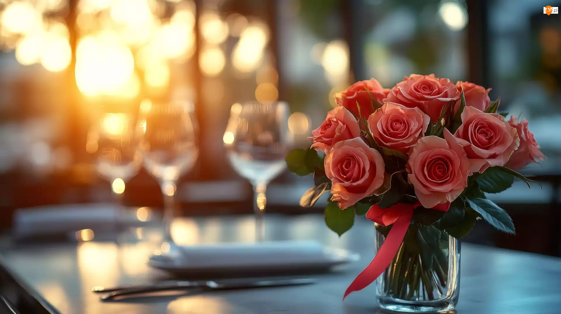 Róże, Wstążka, Czerwone, Kwiaty, Wazon