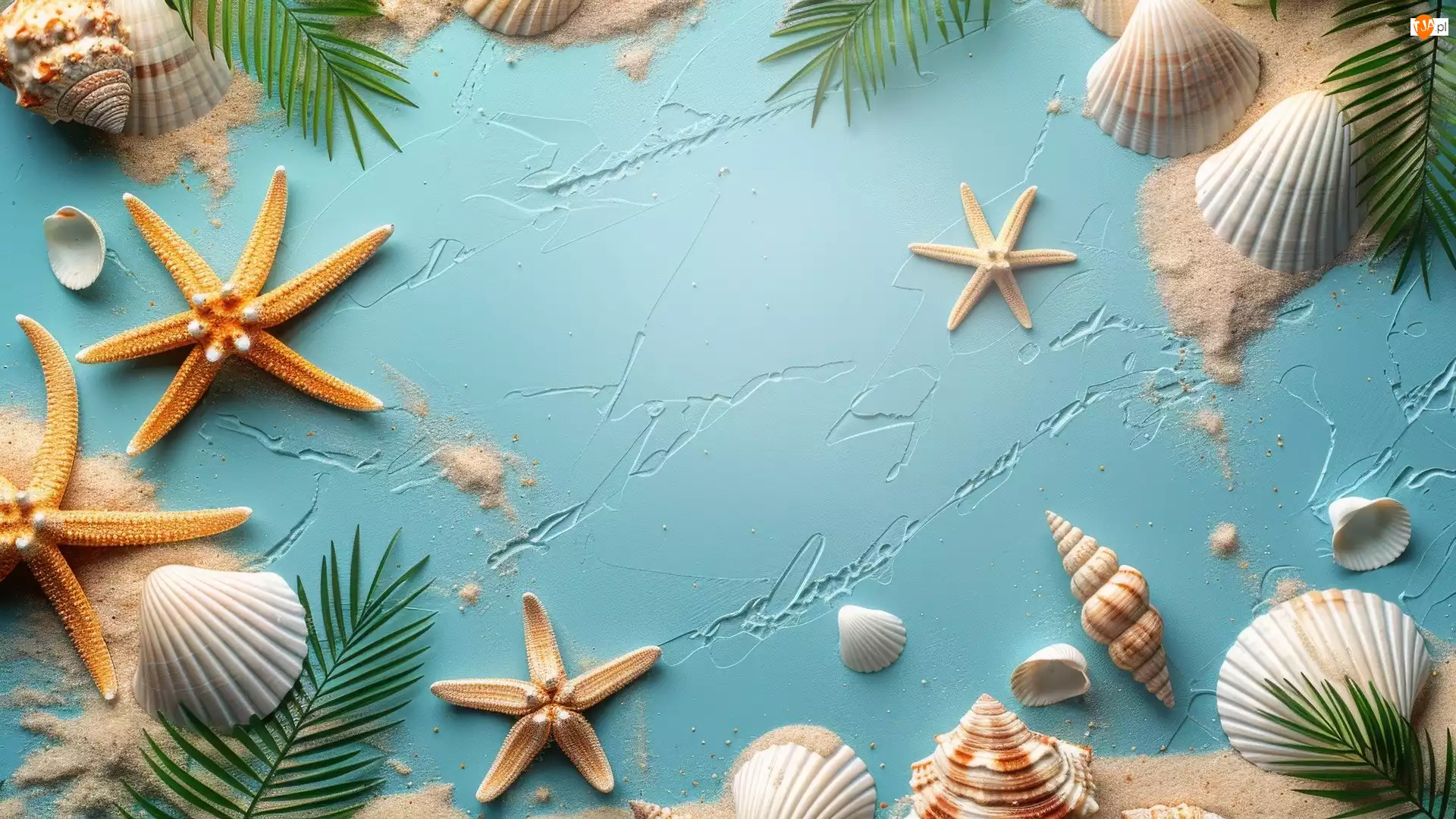Rozgwiazdy, Muszelki, Piasek, Tło, Liście, Niebieskie
