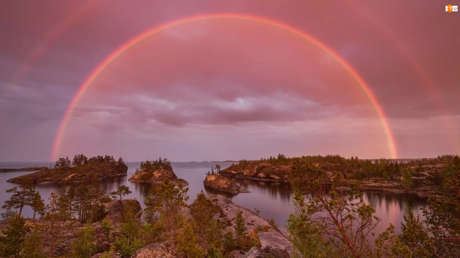 Różowa tęcza nad jeziorem Ładoga