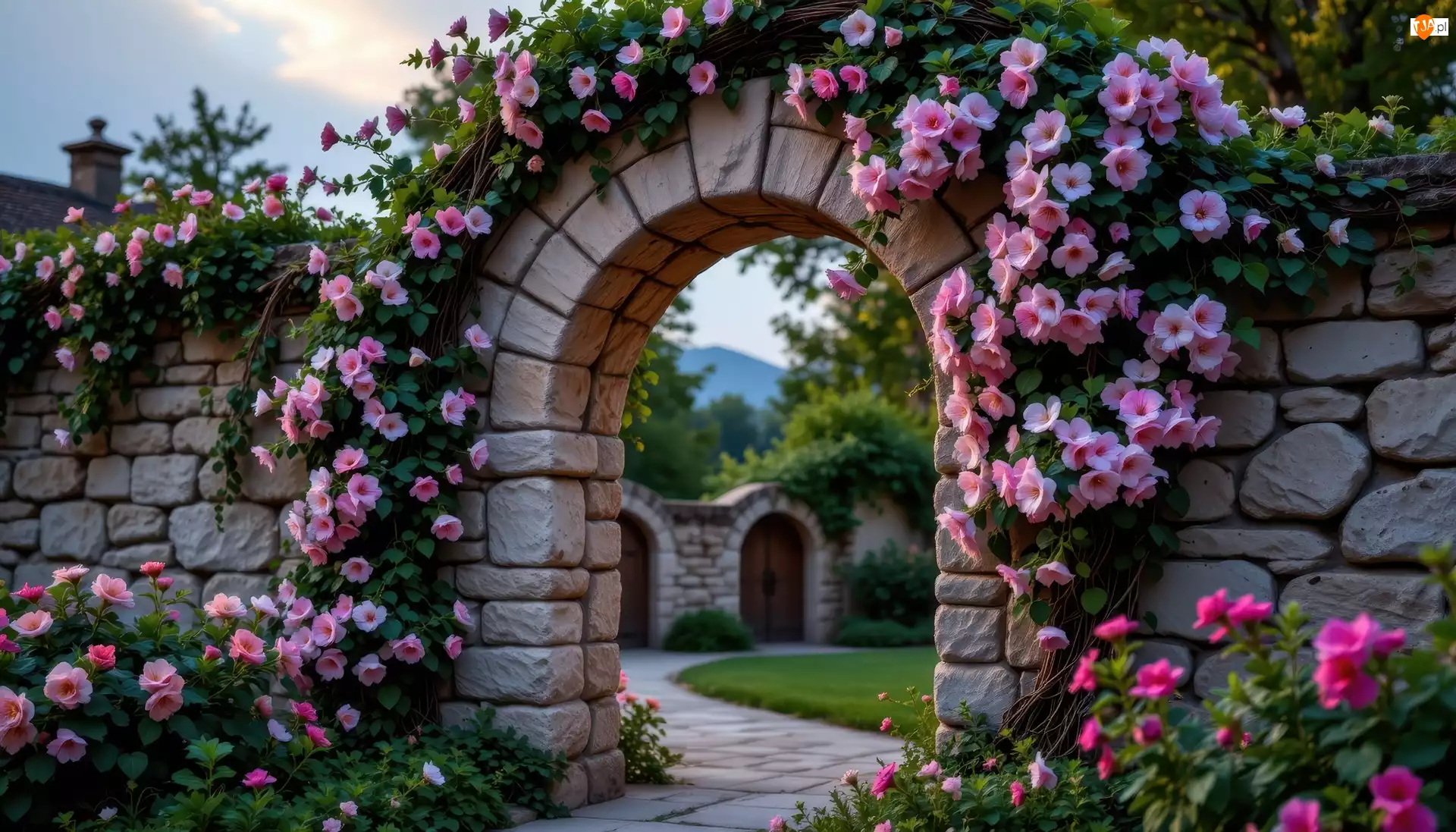 Różowe, Grafika AI, Łuk, Mur, Kwiaty