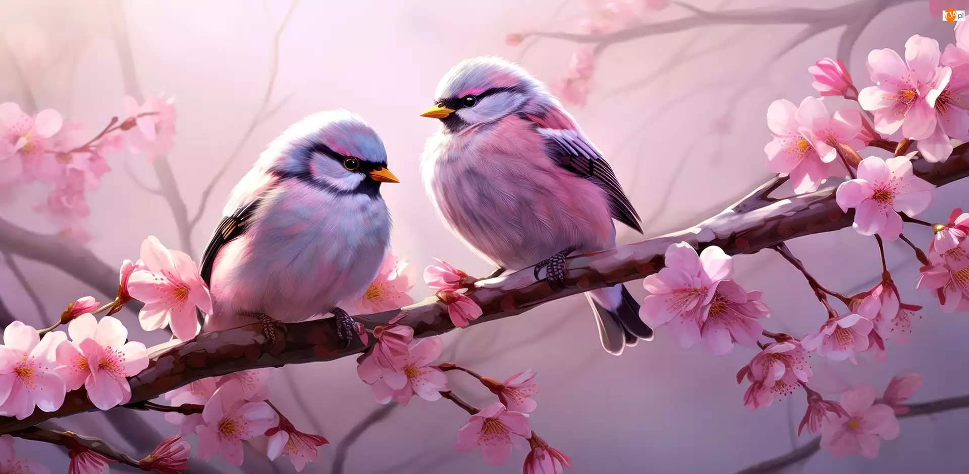 Różowe, Grafika, Gałąź, Ptaki, Kwiaty