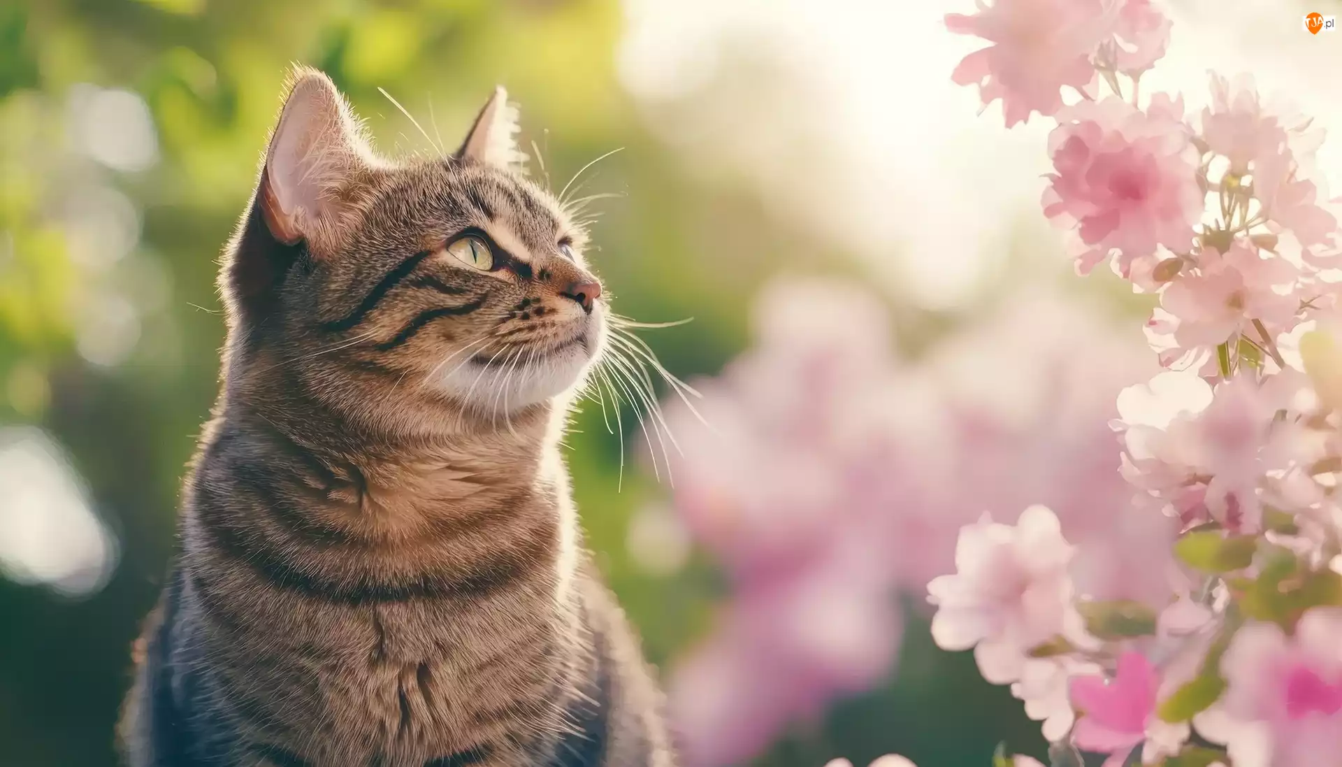 Różowe, Kot, Spojrzenie, Kwiaty