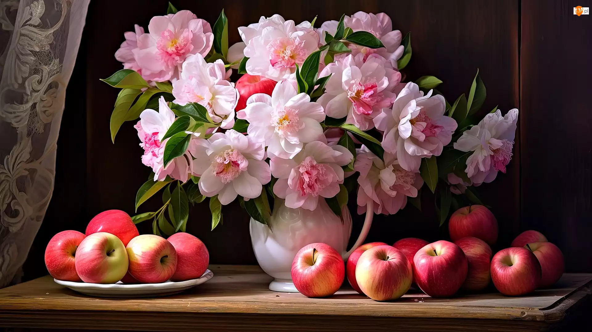 Różowe, Kwiaty, Jabłka, Grafika, Bukiet, Kompoz