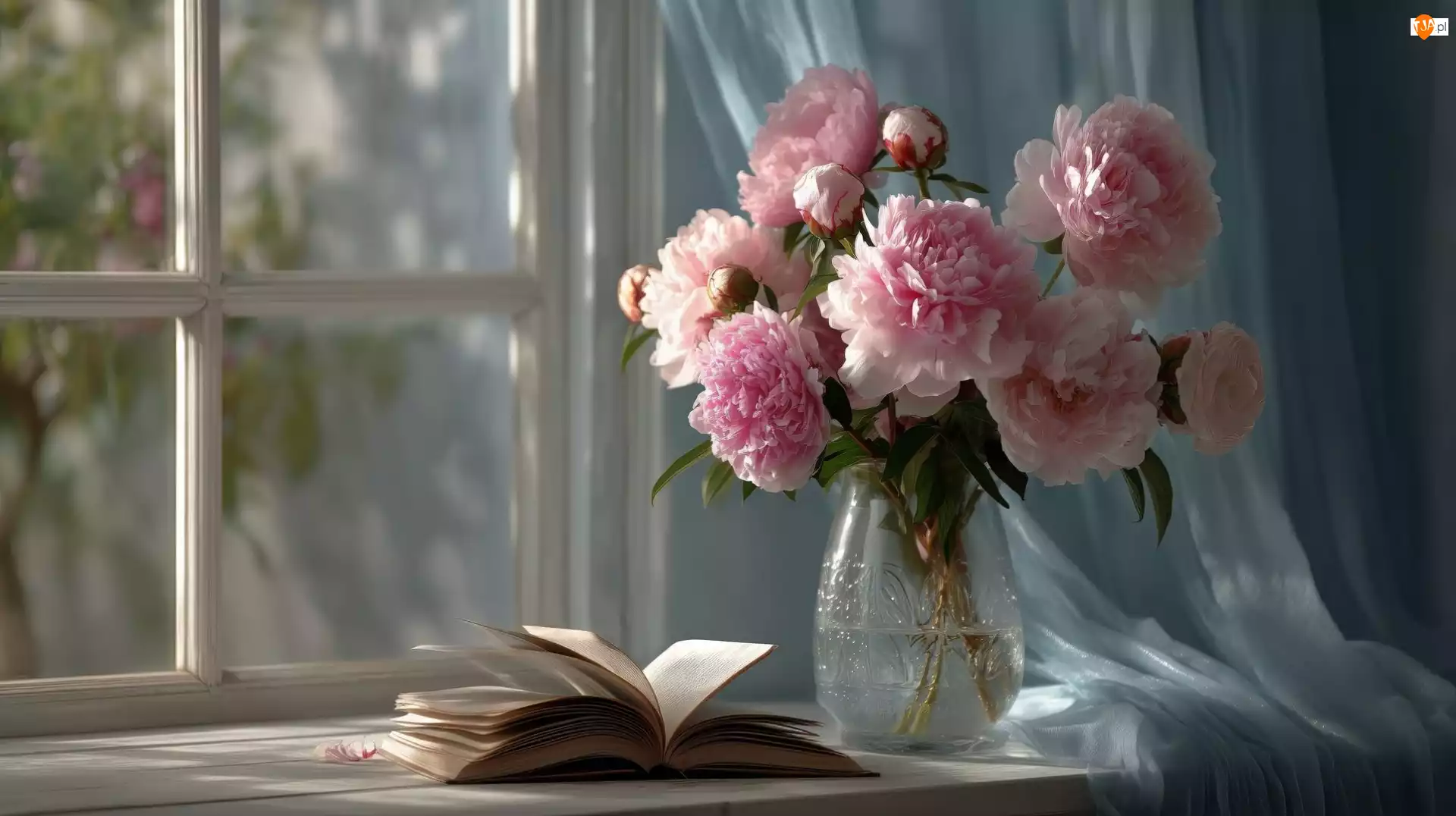 Piwonie, Różowe, Okno, Kwiaty, Parapet, Książka, Wazon