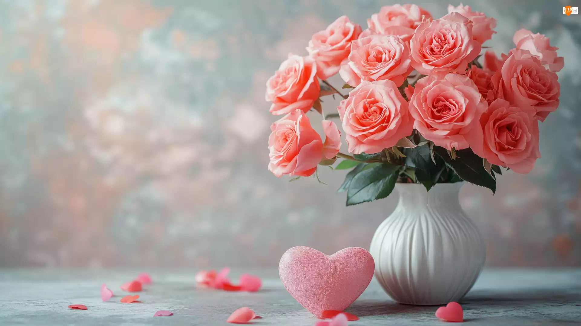 Różowe serduszko obok róż w w białym wazonie