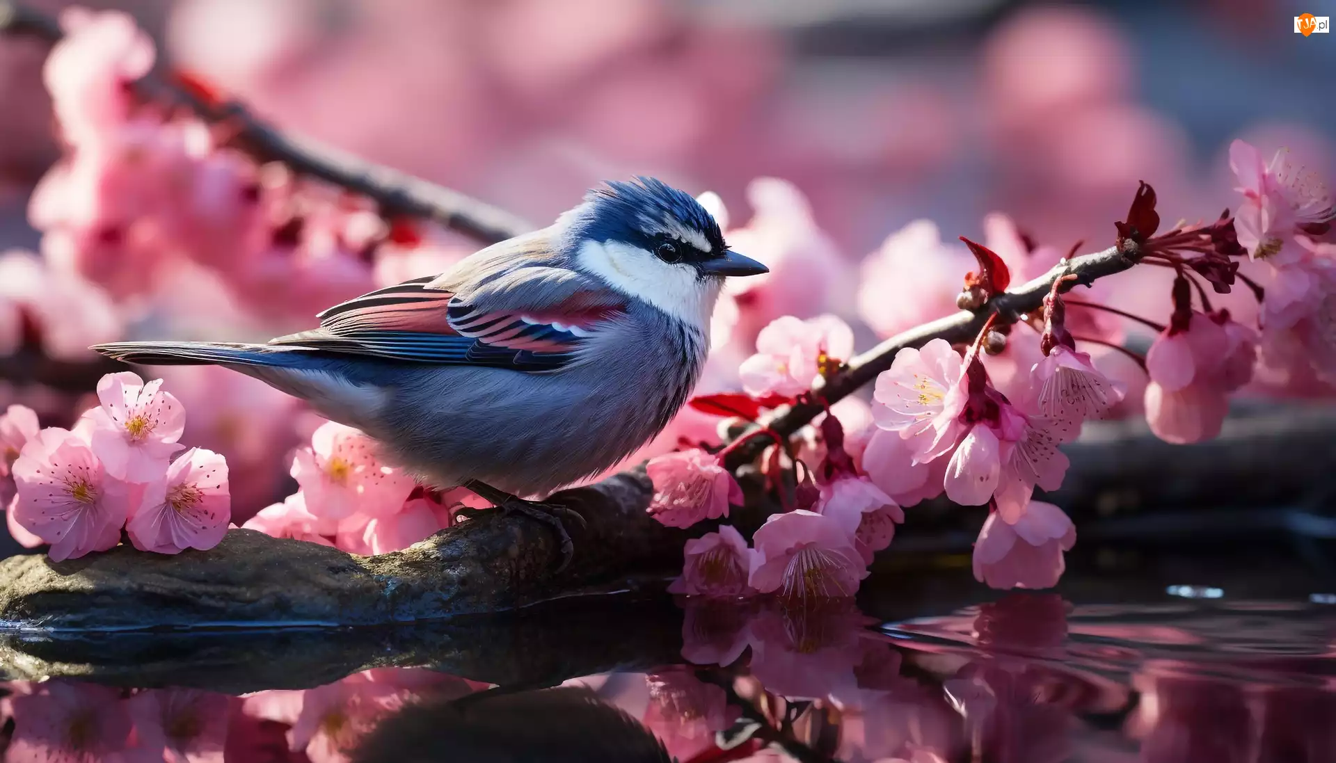 Różowe, Woda, Gałązki, Ptak, Kwiaty