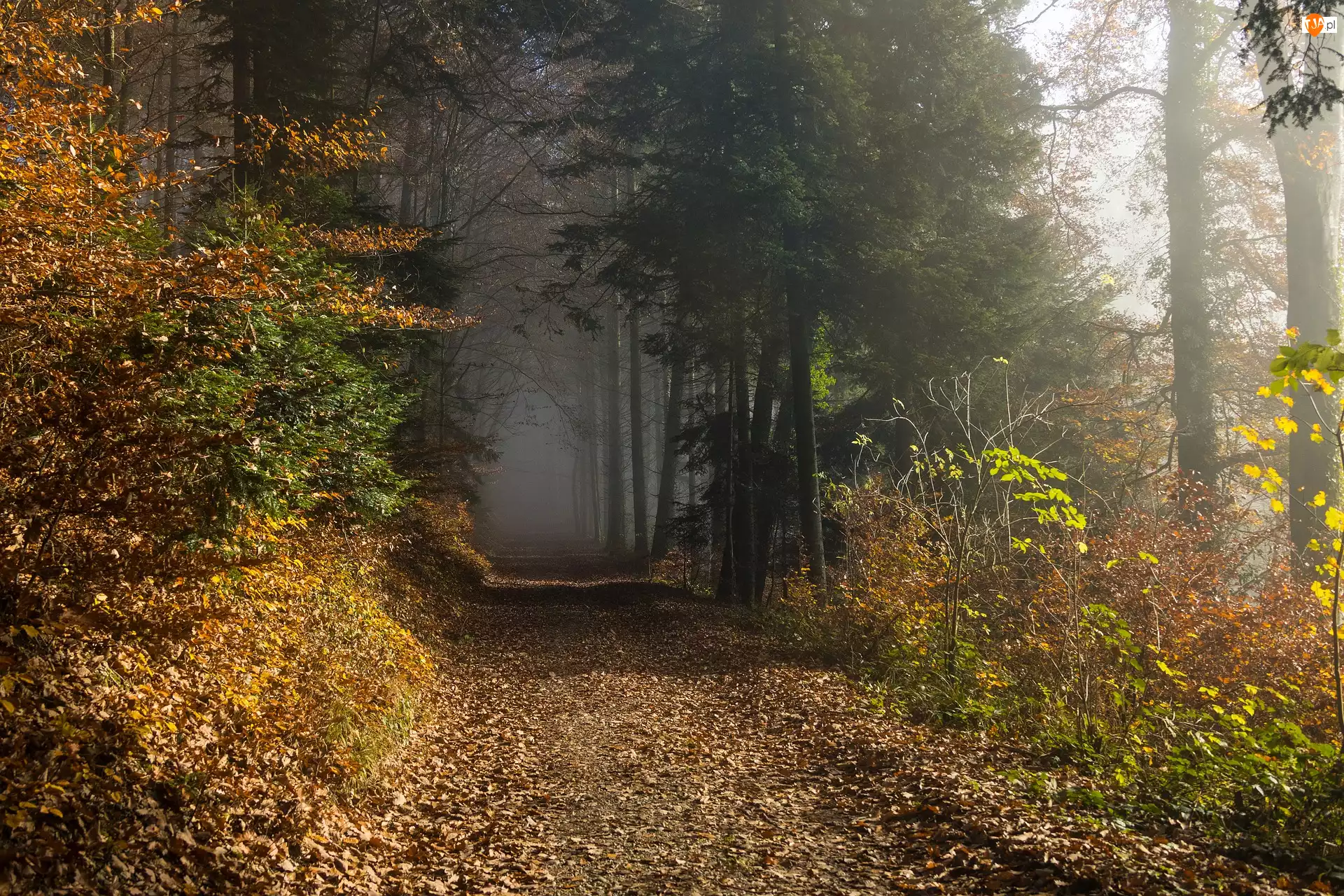 Las, Drzewa, Dzień, Jesień, Słoneczny, Mgła, Ścieżka