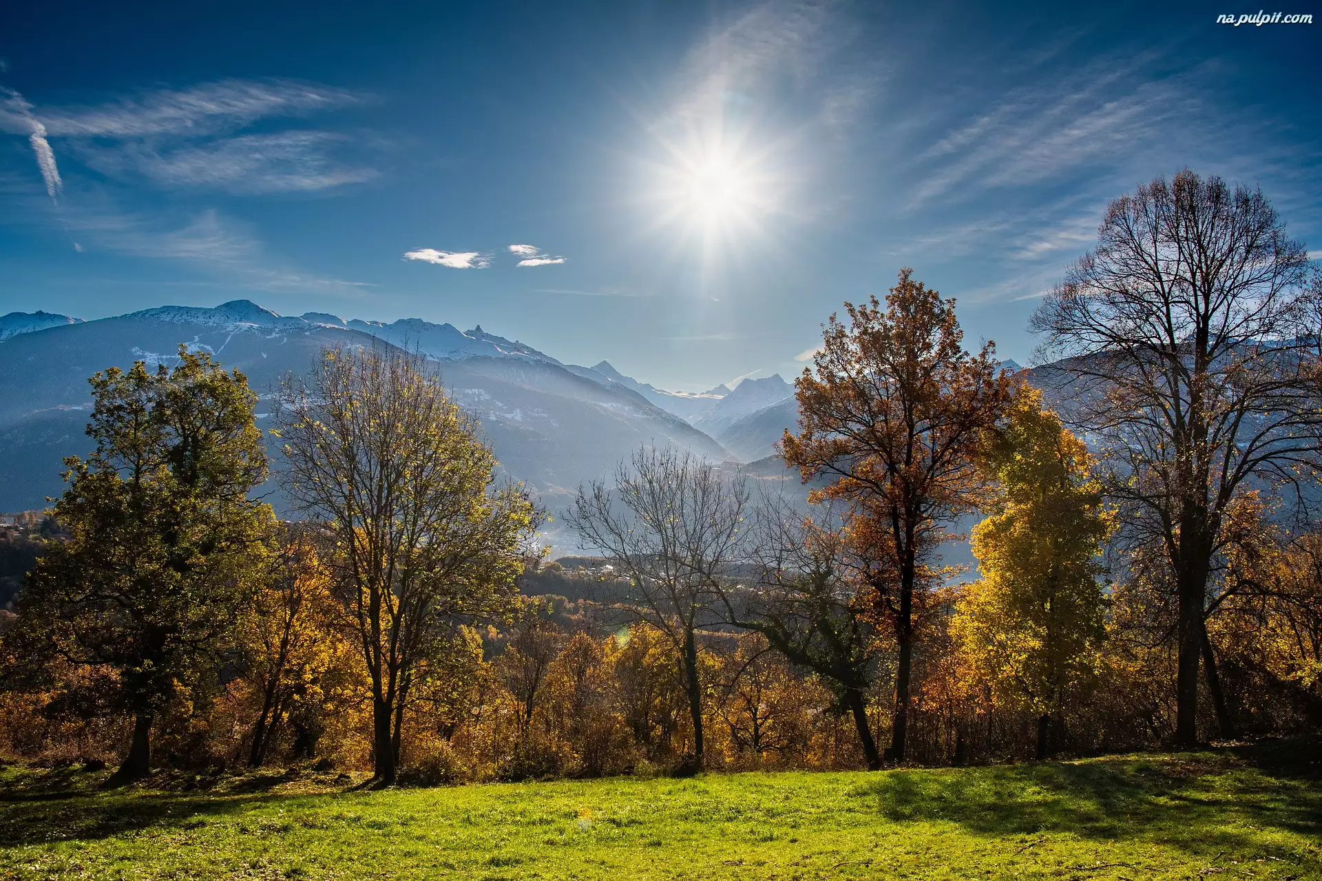 Rozświetlone słońcem ośnieżone góry i jesien