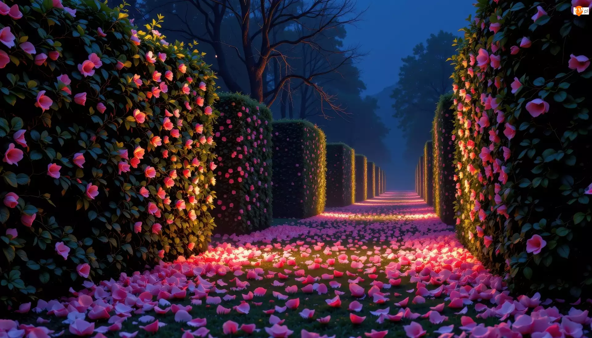 Rozsypane, Noc, Żywopłot, Płatki, Ogród, Kwiaty, Grafika AI, Ścieżka