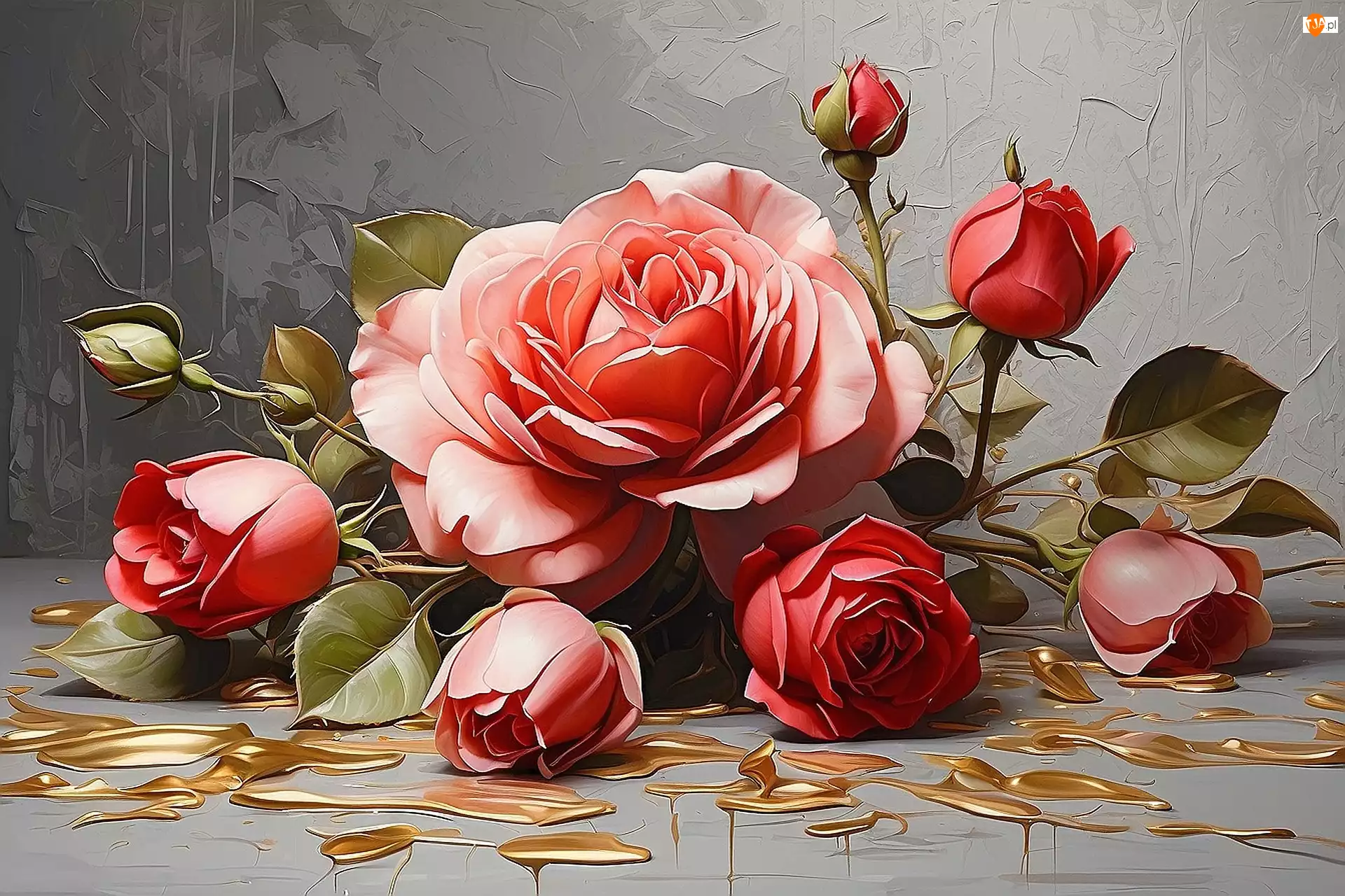 Rozwinięta czerwona róża z pąkami na szarym tl