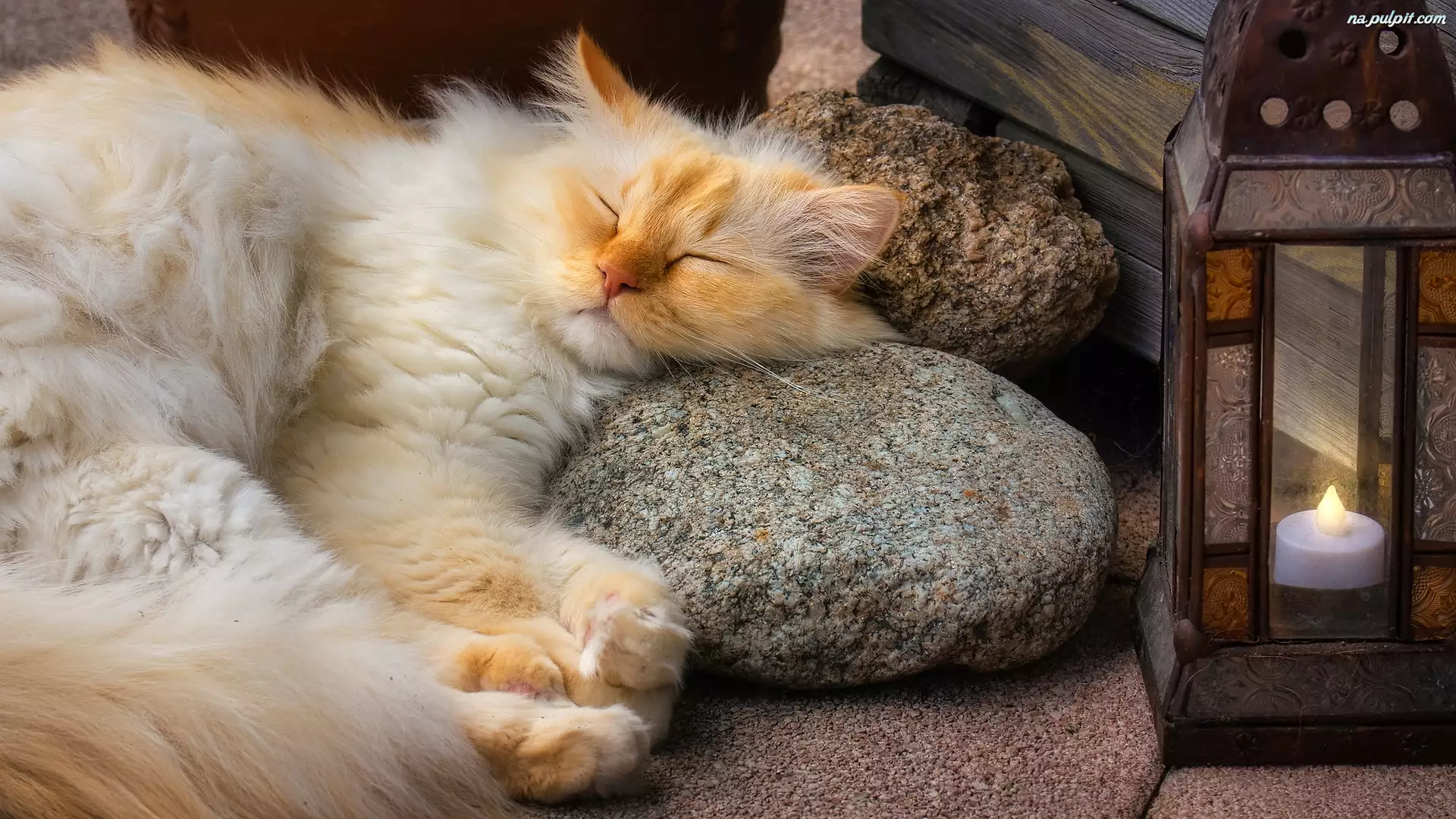 Rudy, Śpiący, Kot, Lampion, Niebieskooki, Kamienie