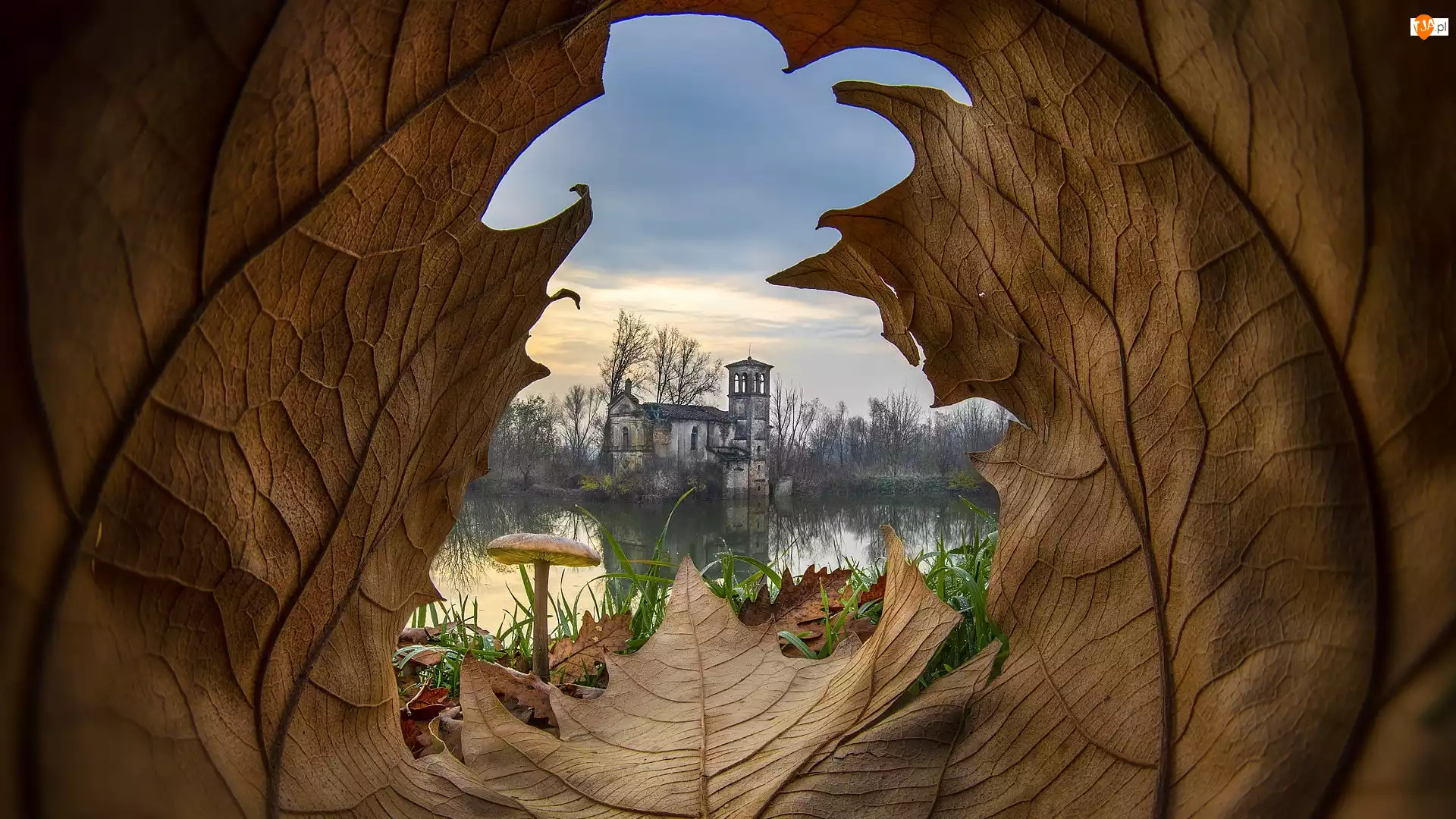 Ruina, Grzyb, Budynek, Liść, Jezioro
