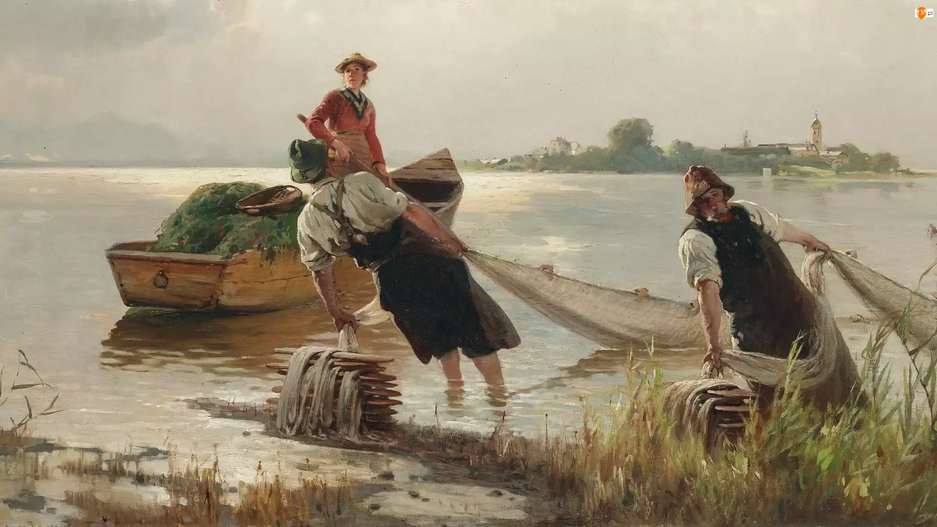 Sieć, Malarstwo, Jezioro, Kobieta, Obraz, Rybacy, Łódka, Karl Raupp
