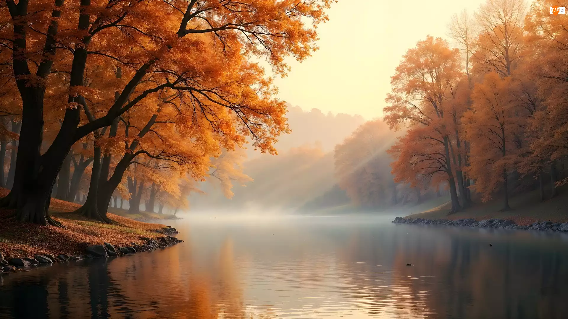 Rzeka, AI, Drzewa, Jesień, Mgła