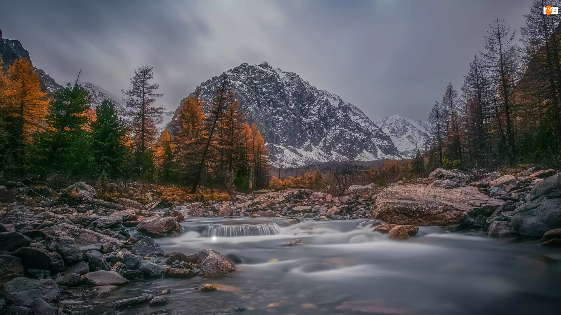Rosja, Góry, Jesień, Góra, Aktru river, Rzeka, Kamienie, Dolina, Drzewa, AŁtaj