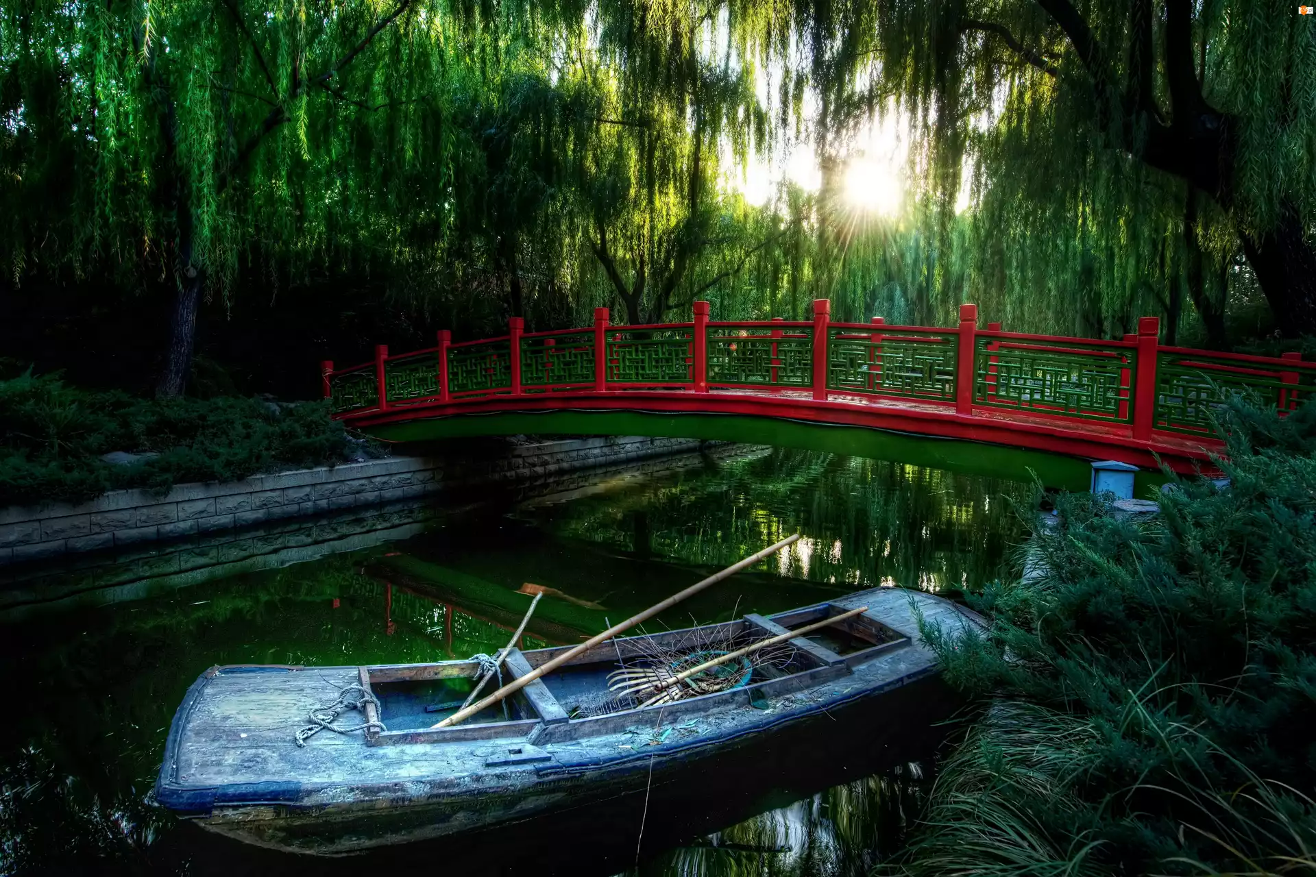 Rzeka, Beijing, Czerwony, Chiny , Mostek, Łódka