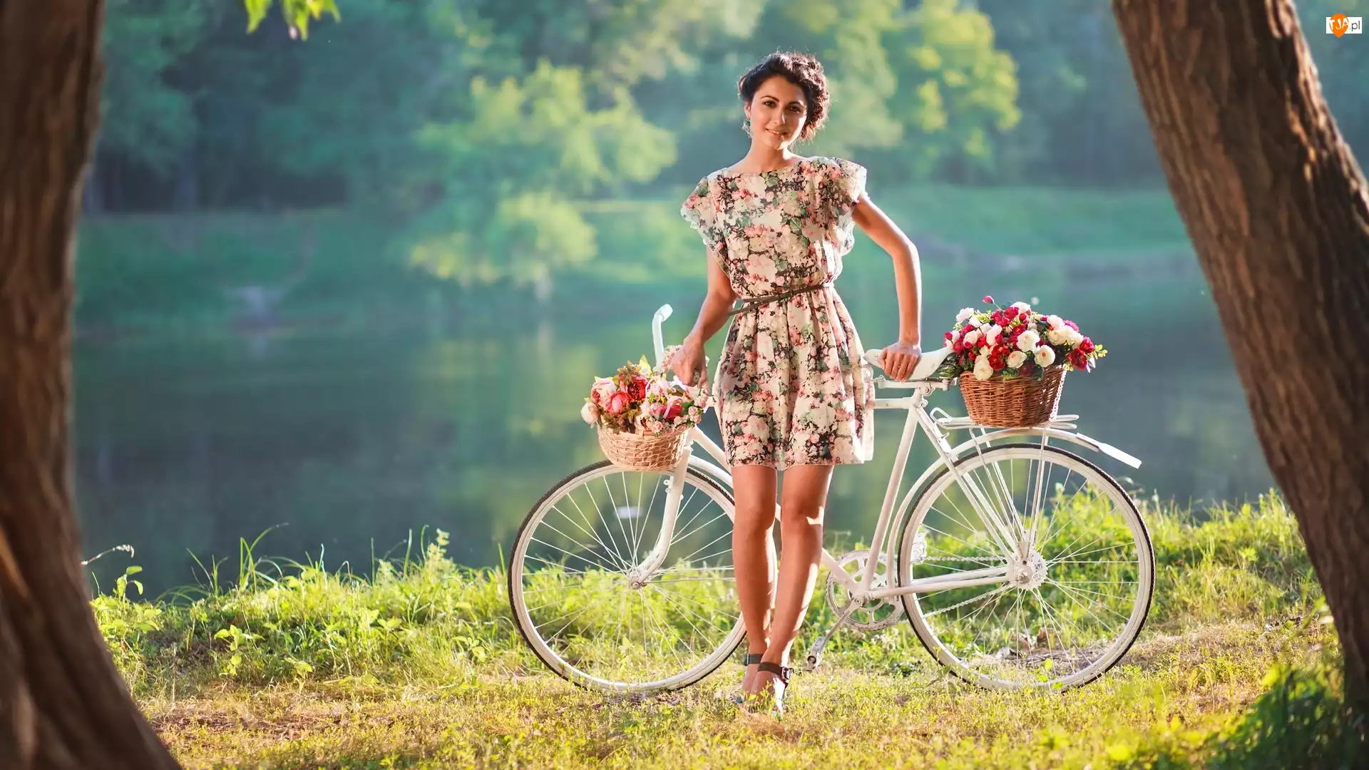 Rzeka, Brunetka, Koszyki, Rower, Kwiaty