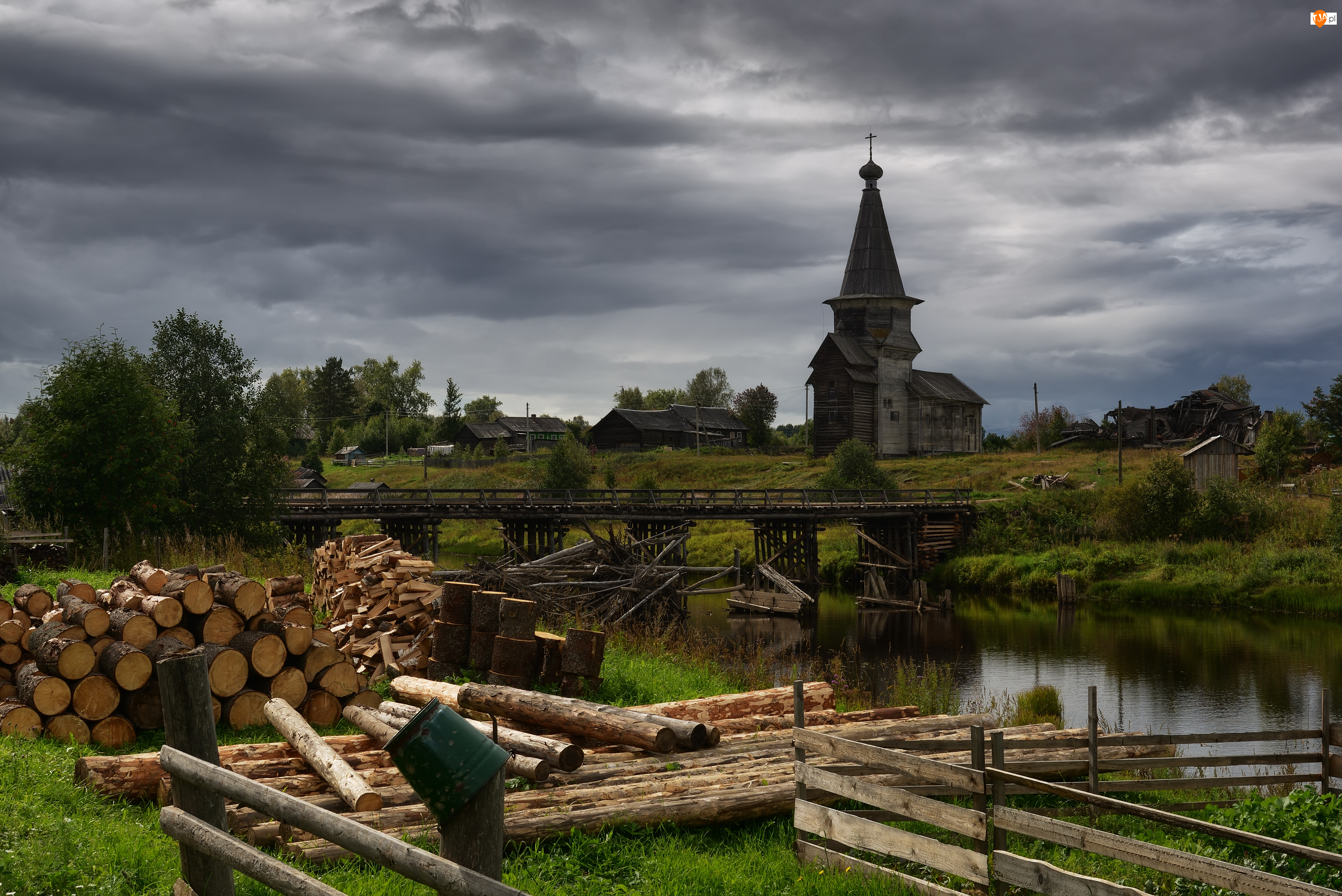 Rzeka, Cerkiew, Kłody, Domy, Most, Drewna
