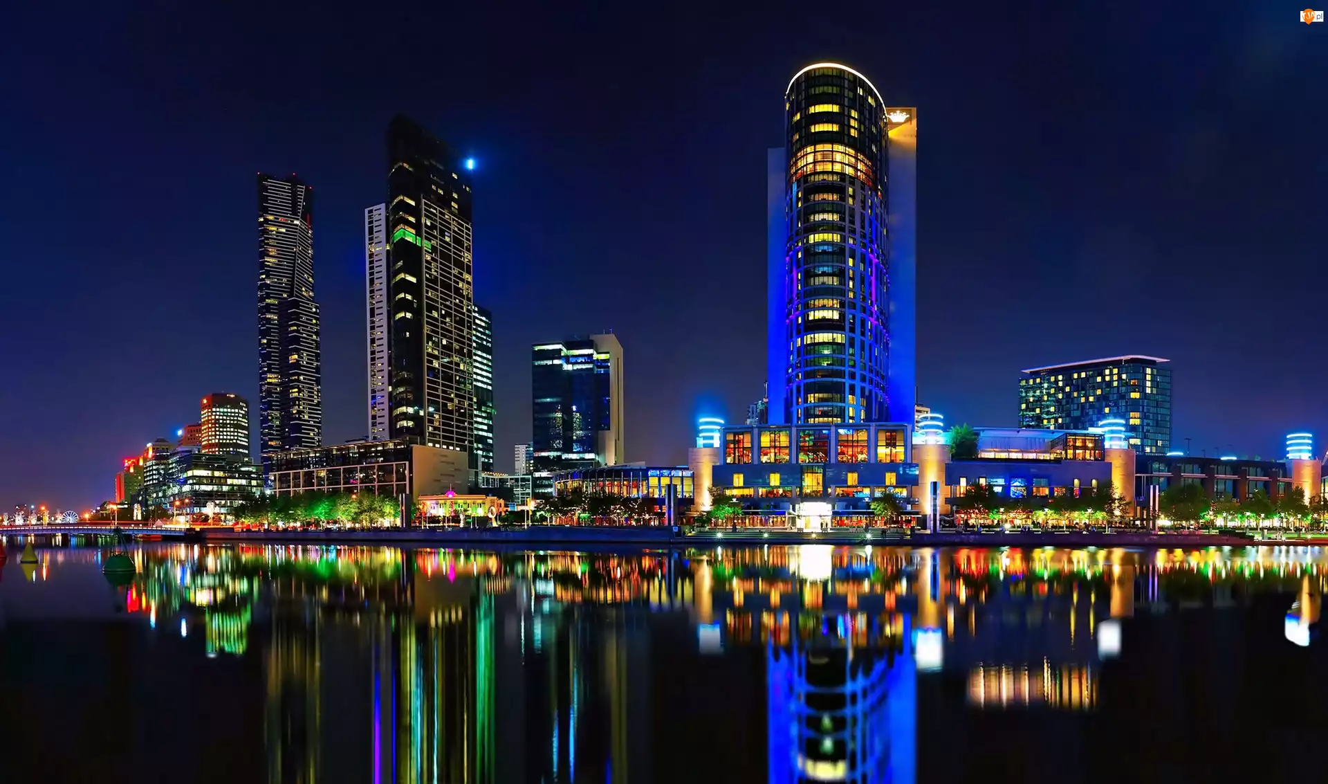 Rzeka, Drapacze, Miasto, Brisbane, Australia, Noc�
