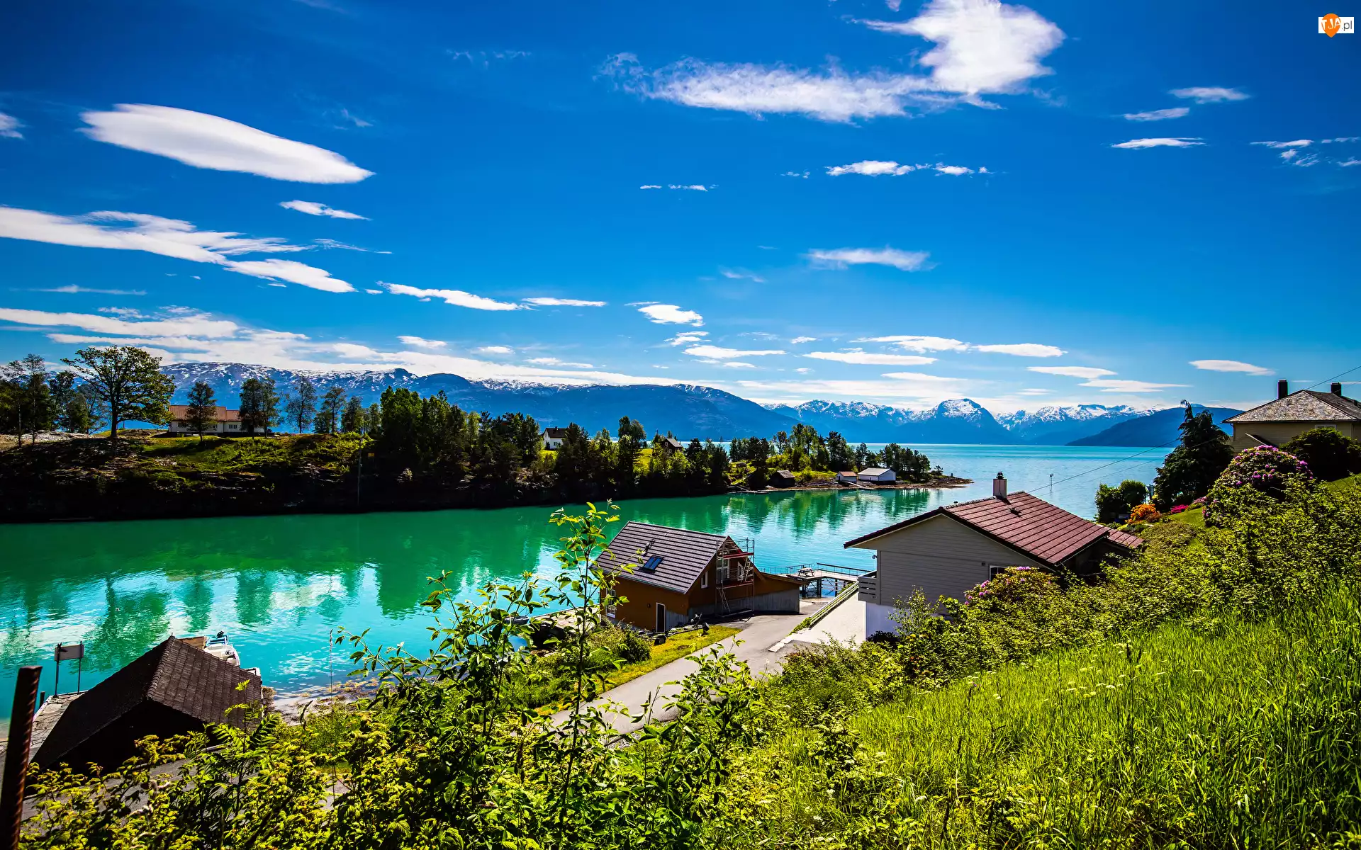 Rzeka, Drzewa, Góry, Domy, Niebo