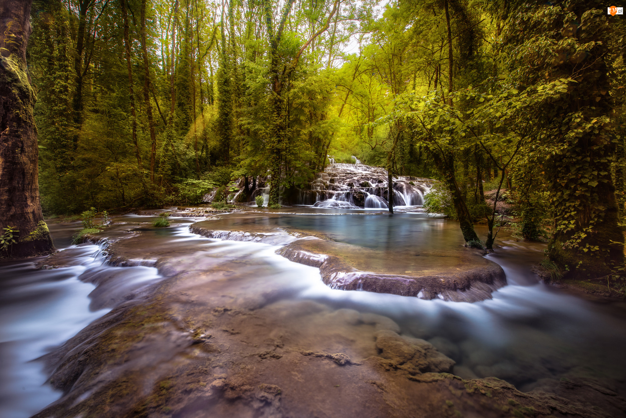 Rzeka, Drzewa, Kaskada, Wodospad, Las
