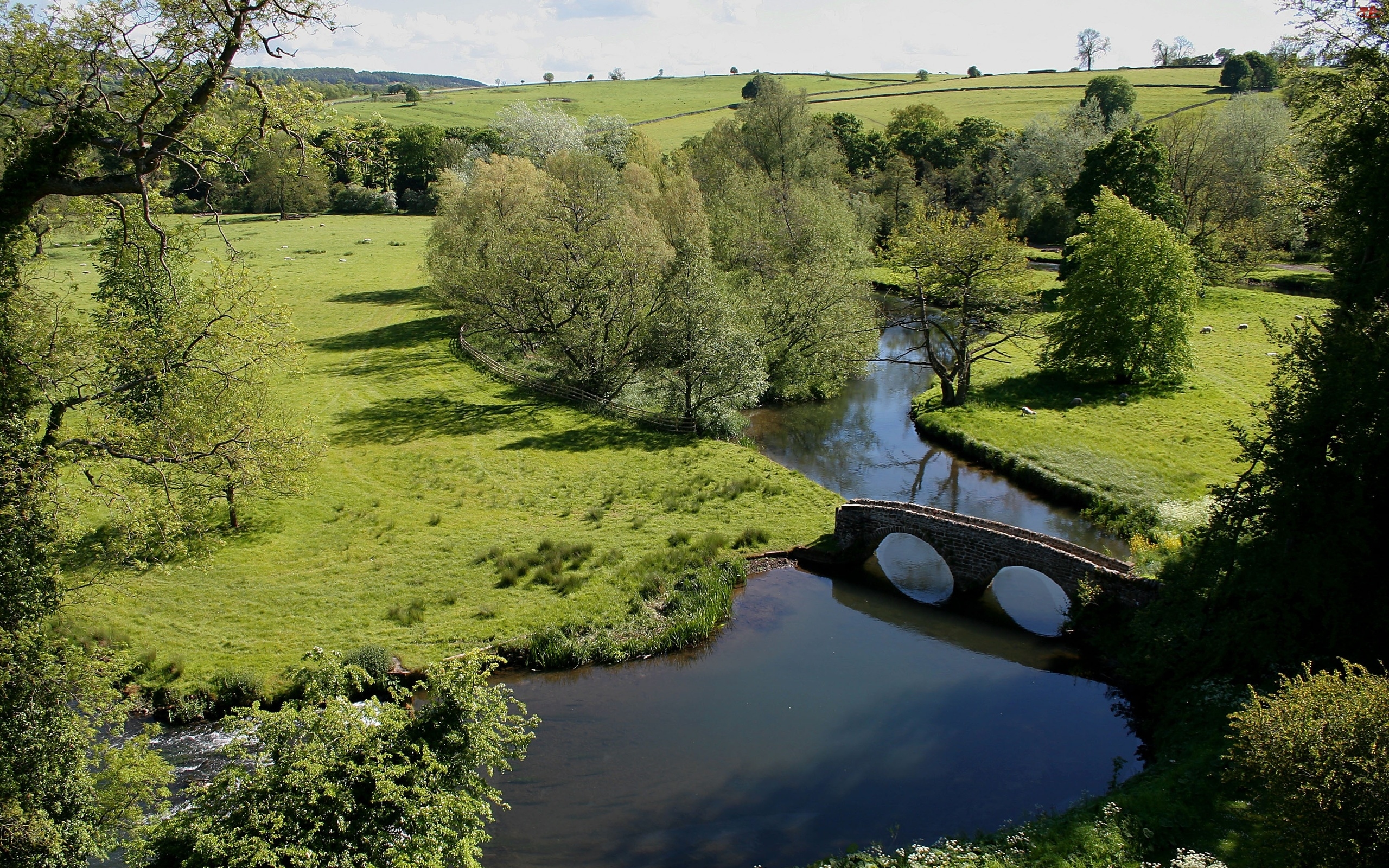 Rzeka, Drzewa, Most, Łąki