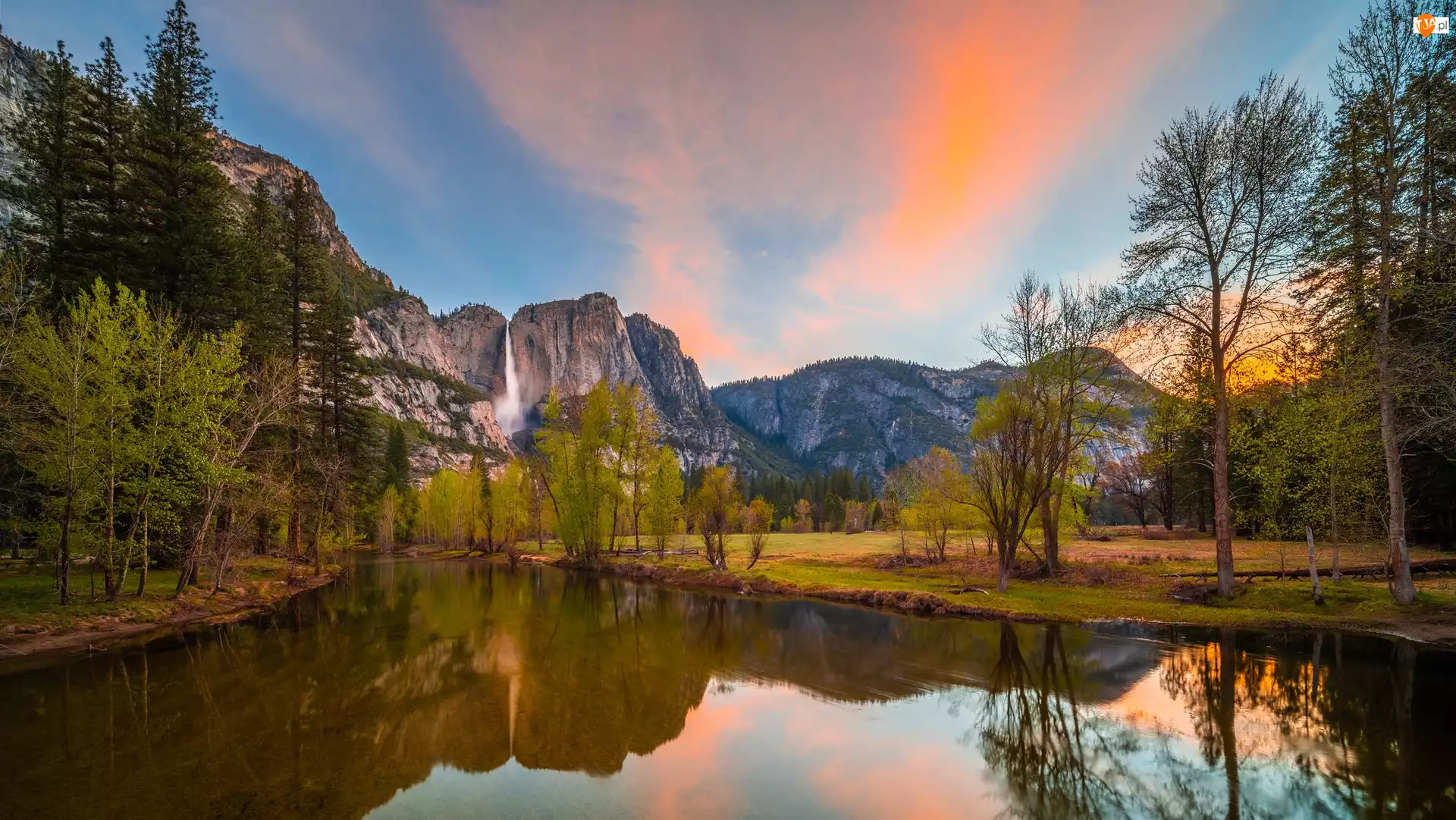 Rzeka, Drzewa, Sierra Nevada, Merced River, Park Narodowy Yosemite, Wodospad, Odbicie, Góry