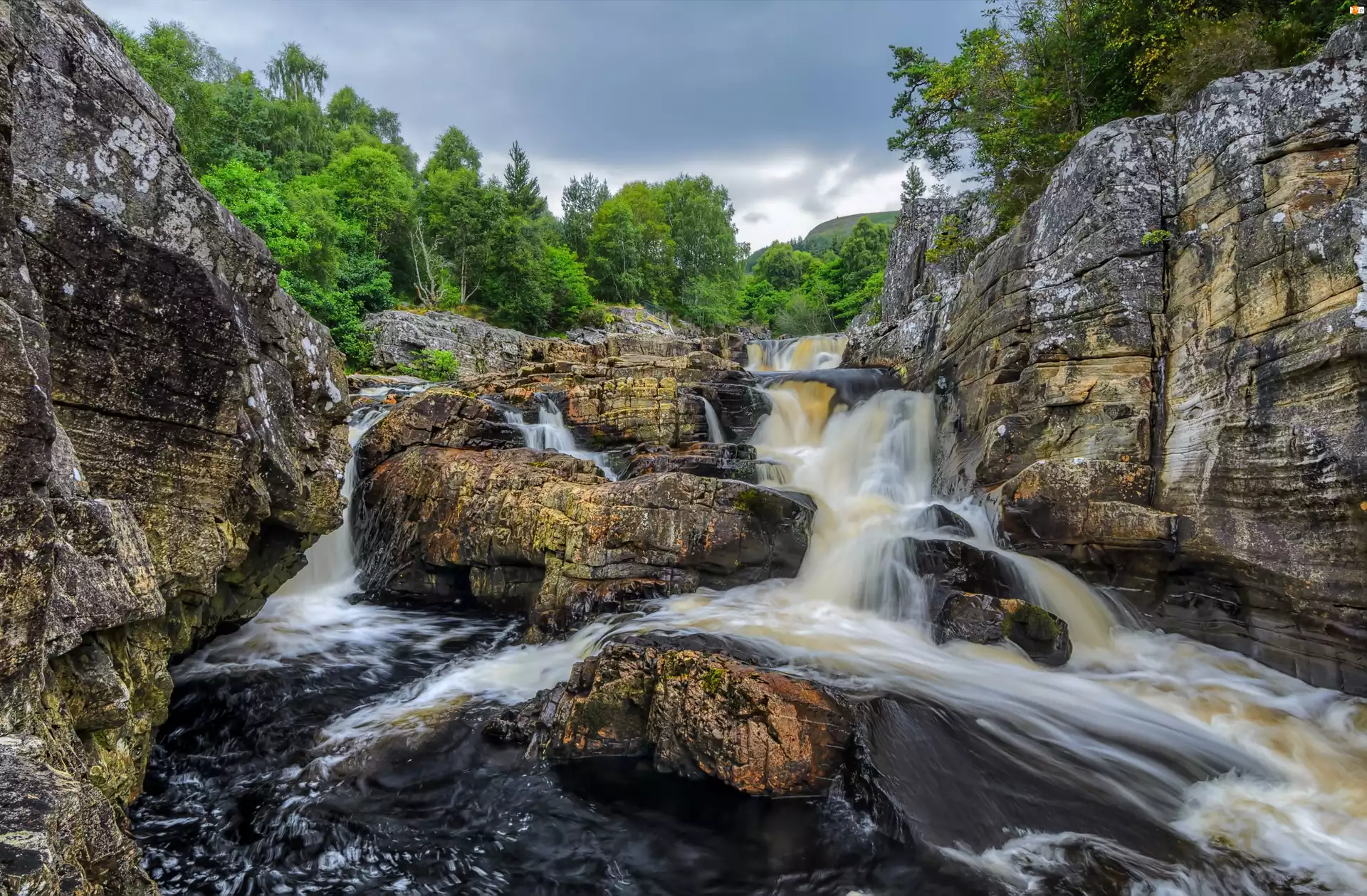 Rzeka, Drzewa, Wodospad, Skały