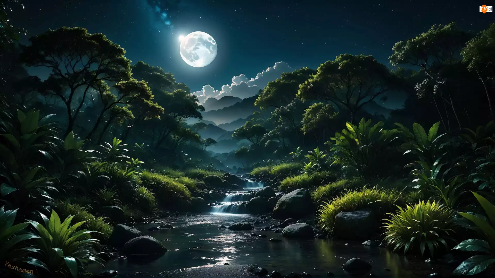 Rzeka, Grafika, Księżyc, Drzewa, Noc, Roślinno�