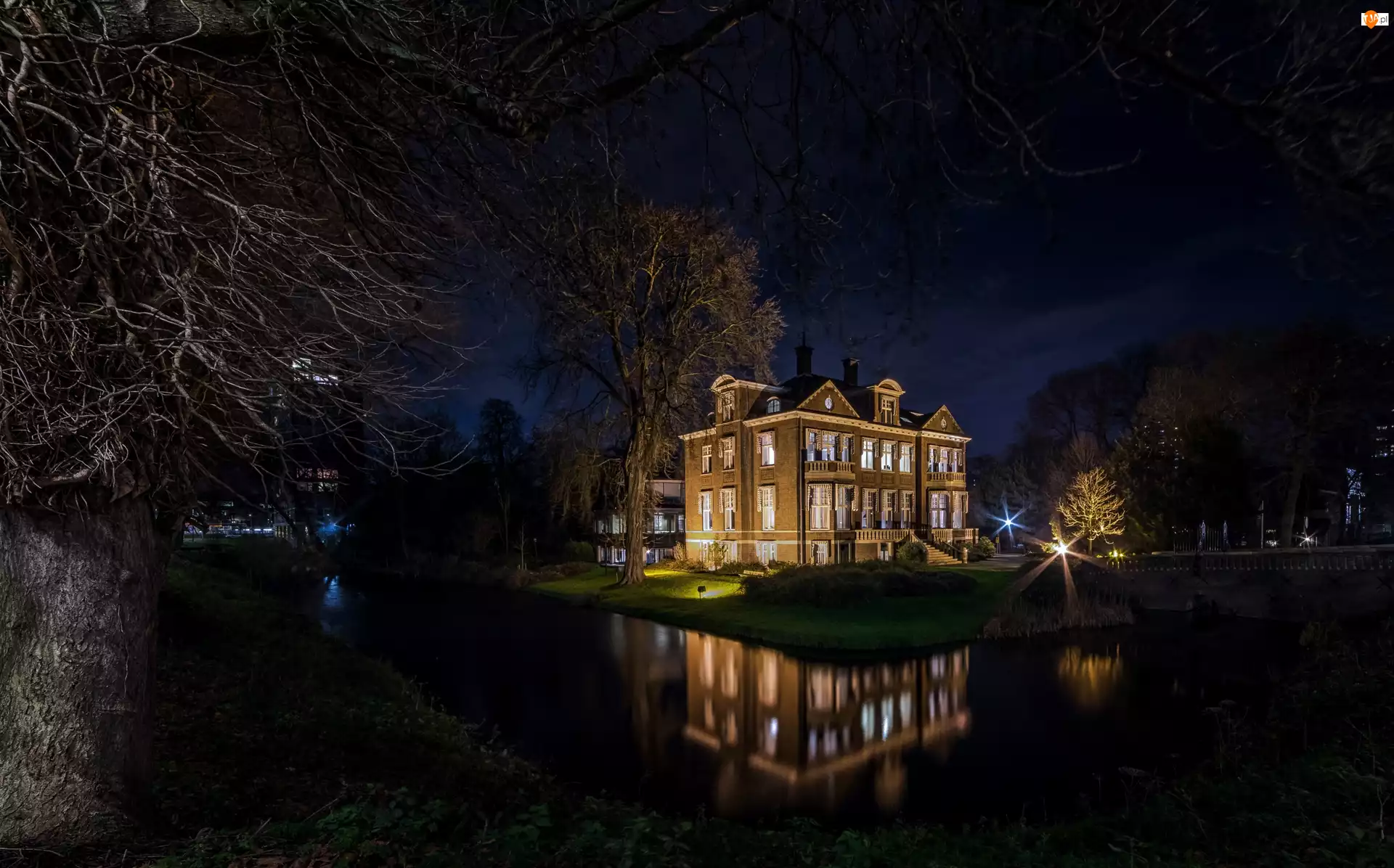 Rzeka, Rotterdam, Noc, Holandia, Domy
