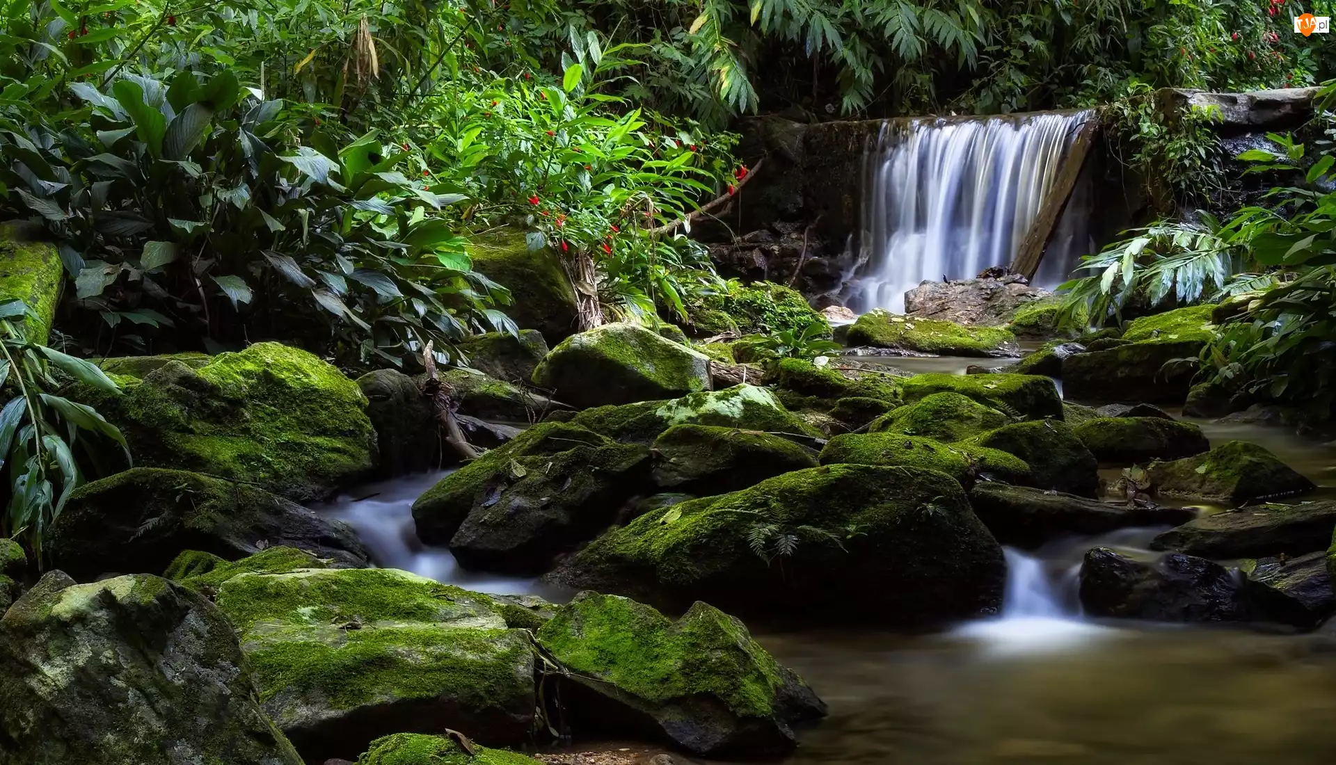 Rzeka, Kamienie, Roślinność, Wodospad, Omszałe