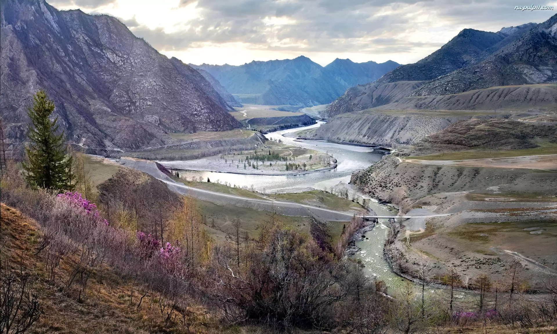 Rzeka, Kwiaty, Kręta, Góry, Drzewa