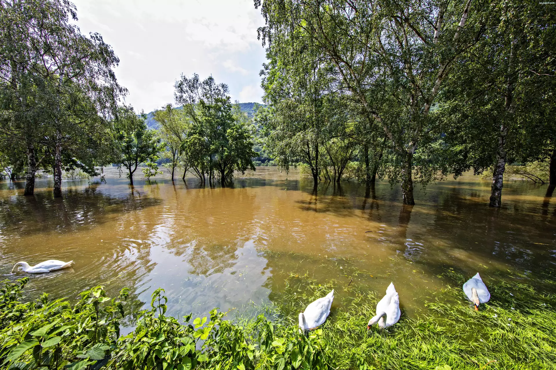 Rzeka, Łabędzie, Zalane, Drzewa