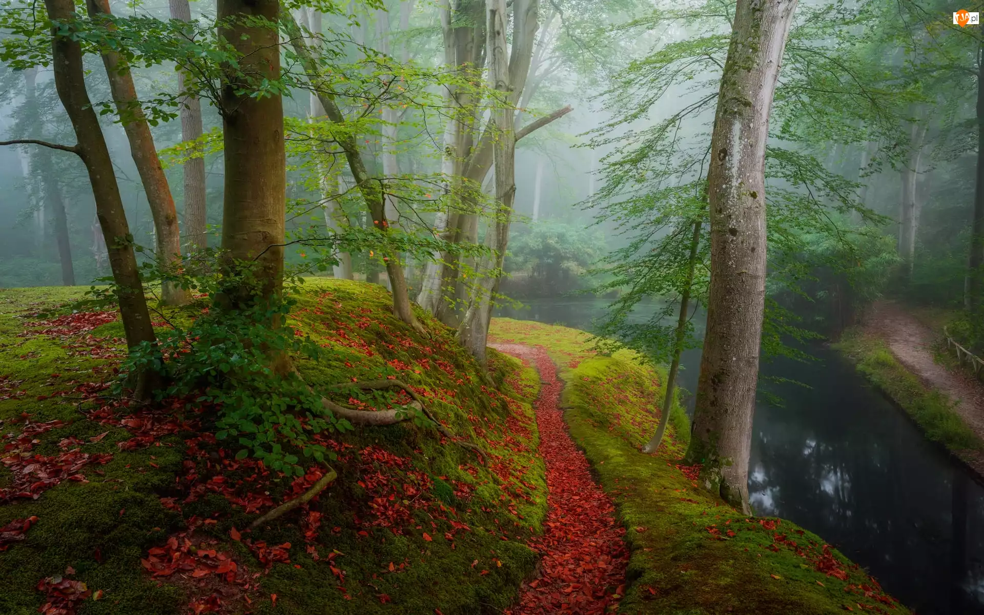 Rzeka, Las, Drzewa, Ścieżka, Jesień, Mgła