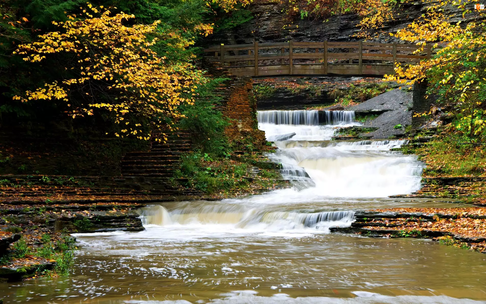 Rzeka, Las, Wodospad, Jesień, Most, Skały