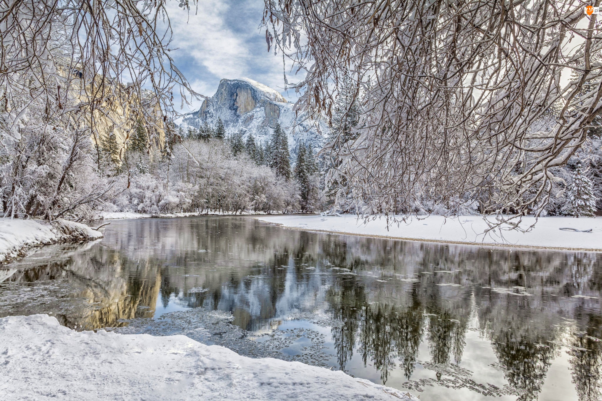Zima, Rzeka Merced River, Stan Kalifornia, Las, Stany Zjednoczone, Drzewa, Park Narodowy Yosemite, Góry