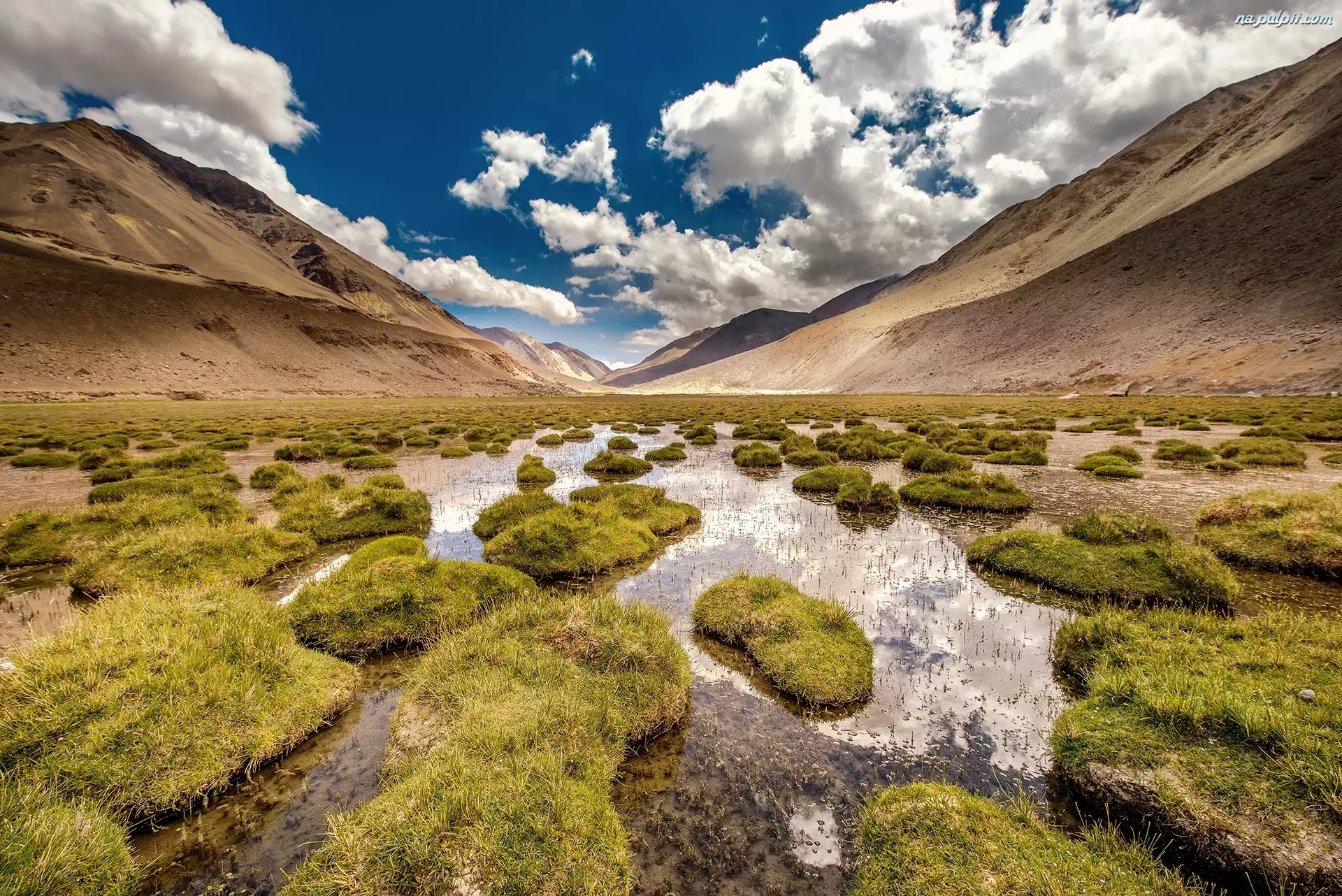 Rzeka między górami pokryta kępami mchu