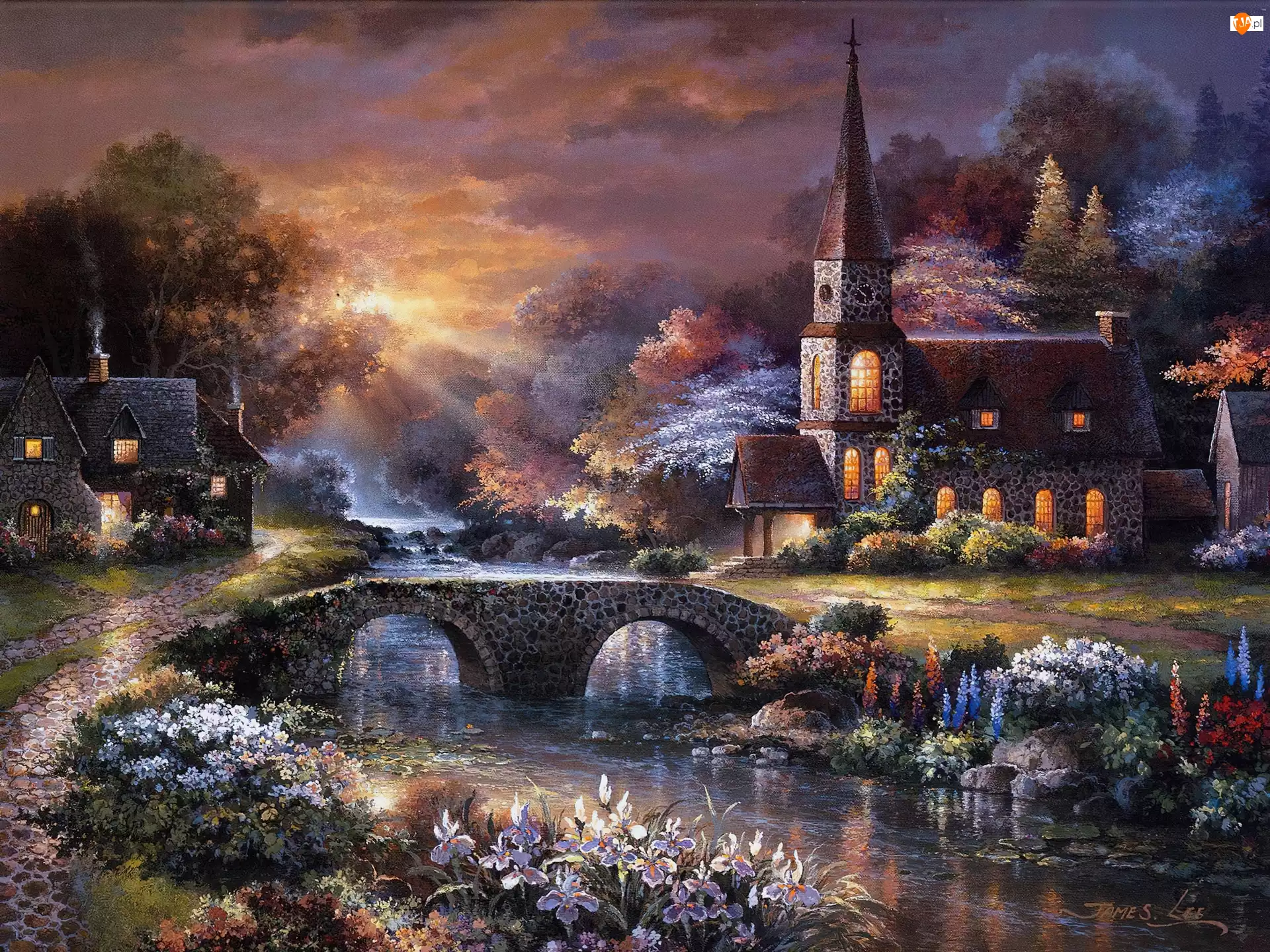 Kościółek, Rzeka, James Lee, Obraz, Mostek