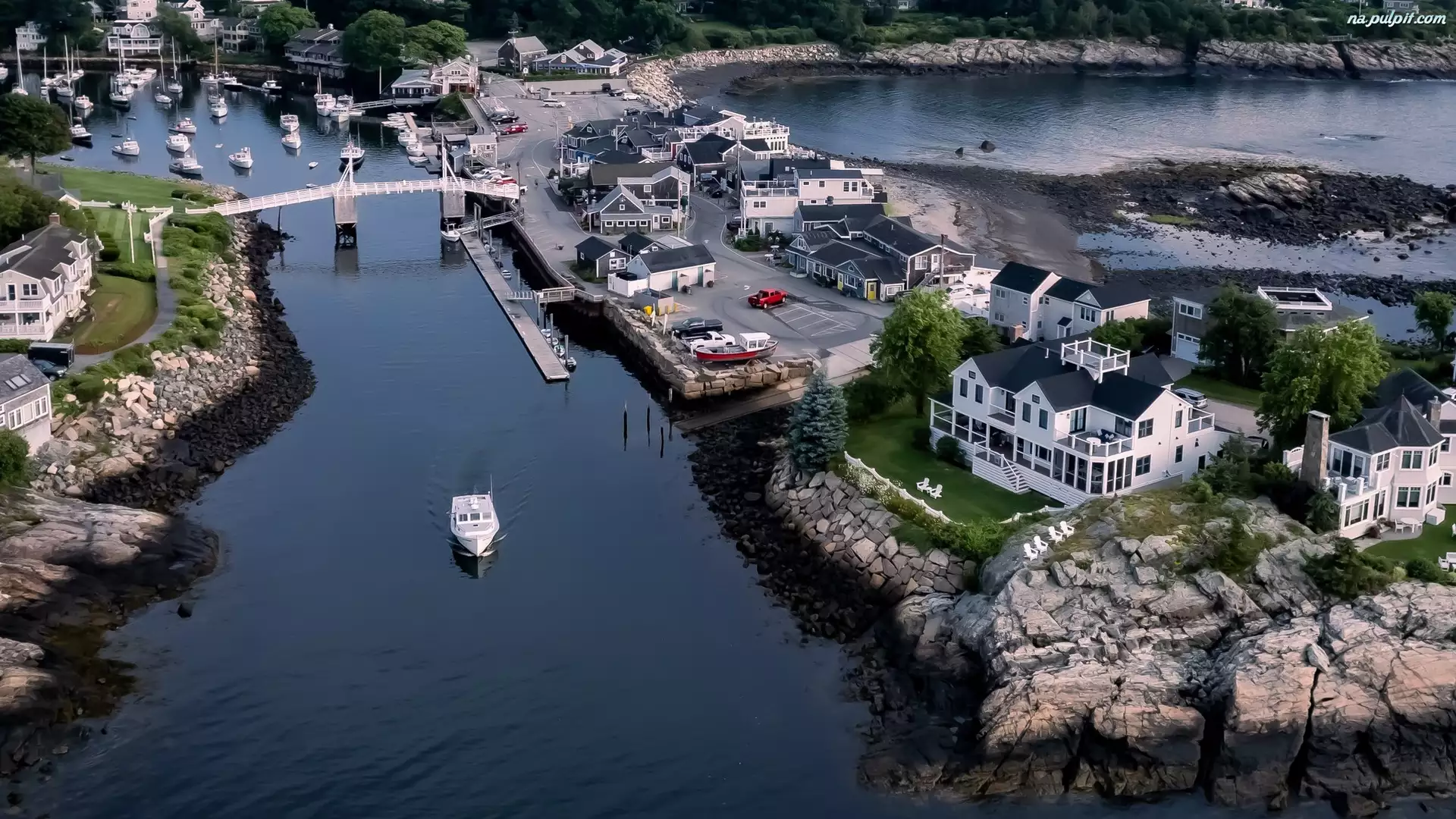 Rzeka Ogunquit, Domy, Żaglówki, Drzewa, Maine, Zatoka, Wybrzeże, Stany Zjednoczone, Przystań, Ogunquit, Z lotu ptaka