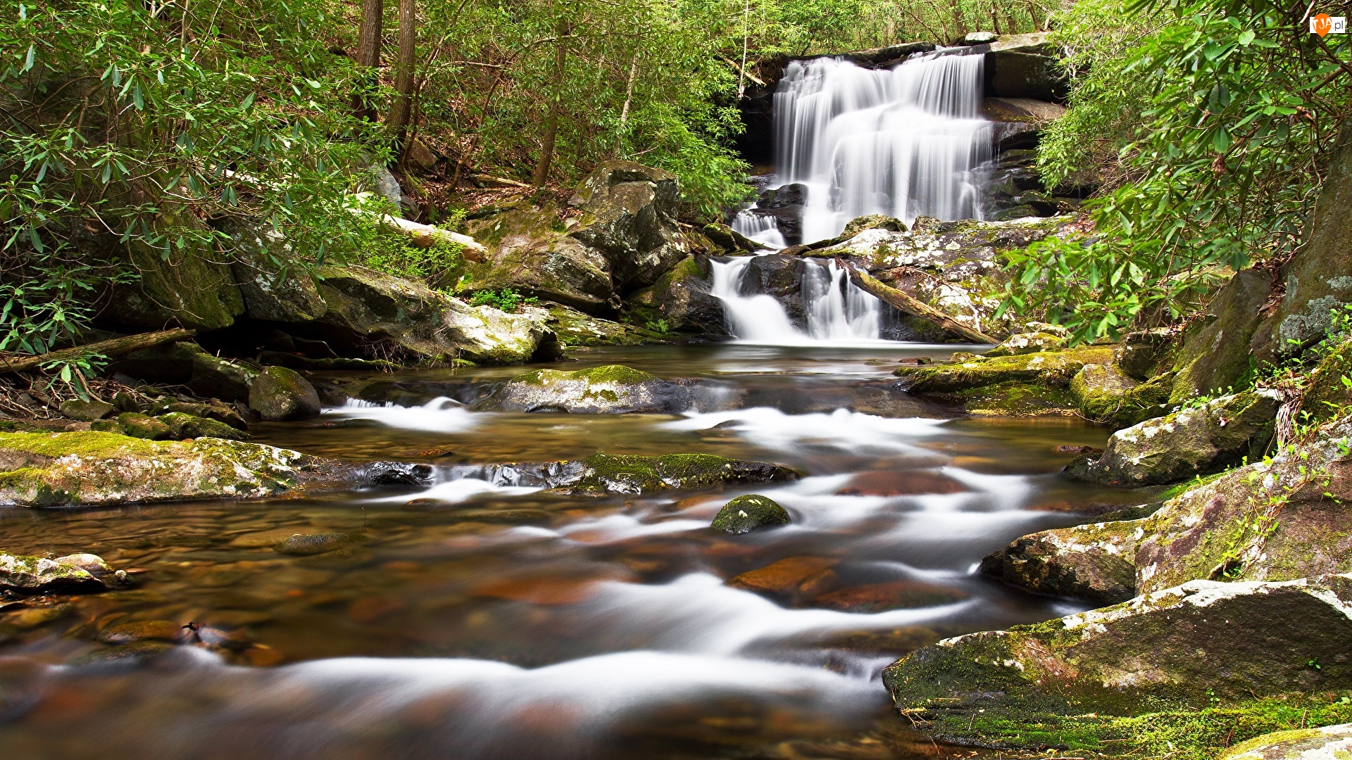 Rzeka, Omszałe, Rośliny, Wodospad, Drzewa, Skał