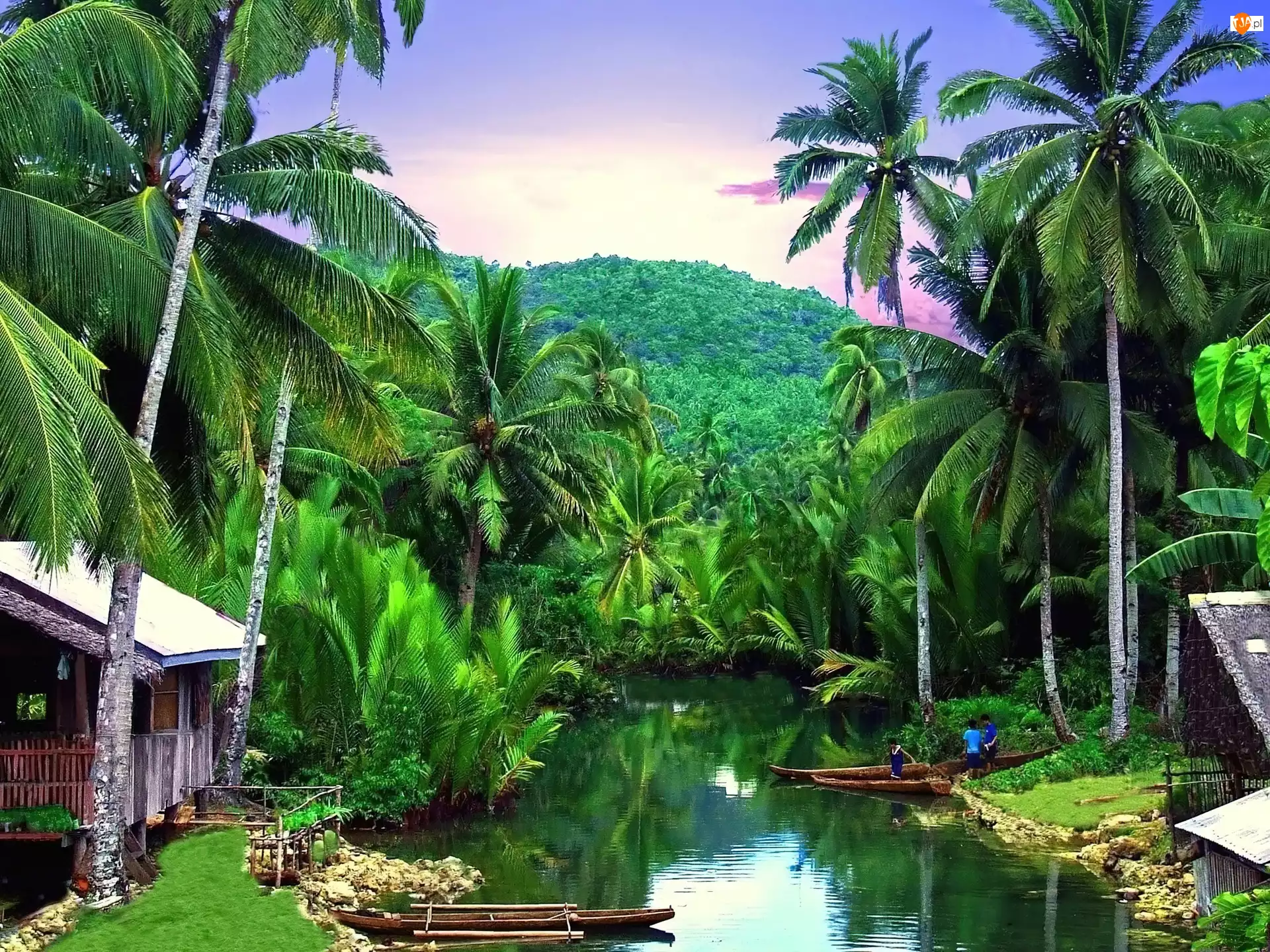 Rzeka, Palmy, Łodzie, Góry