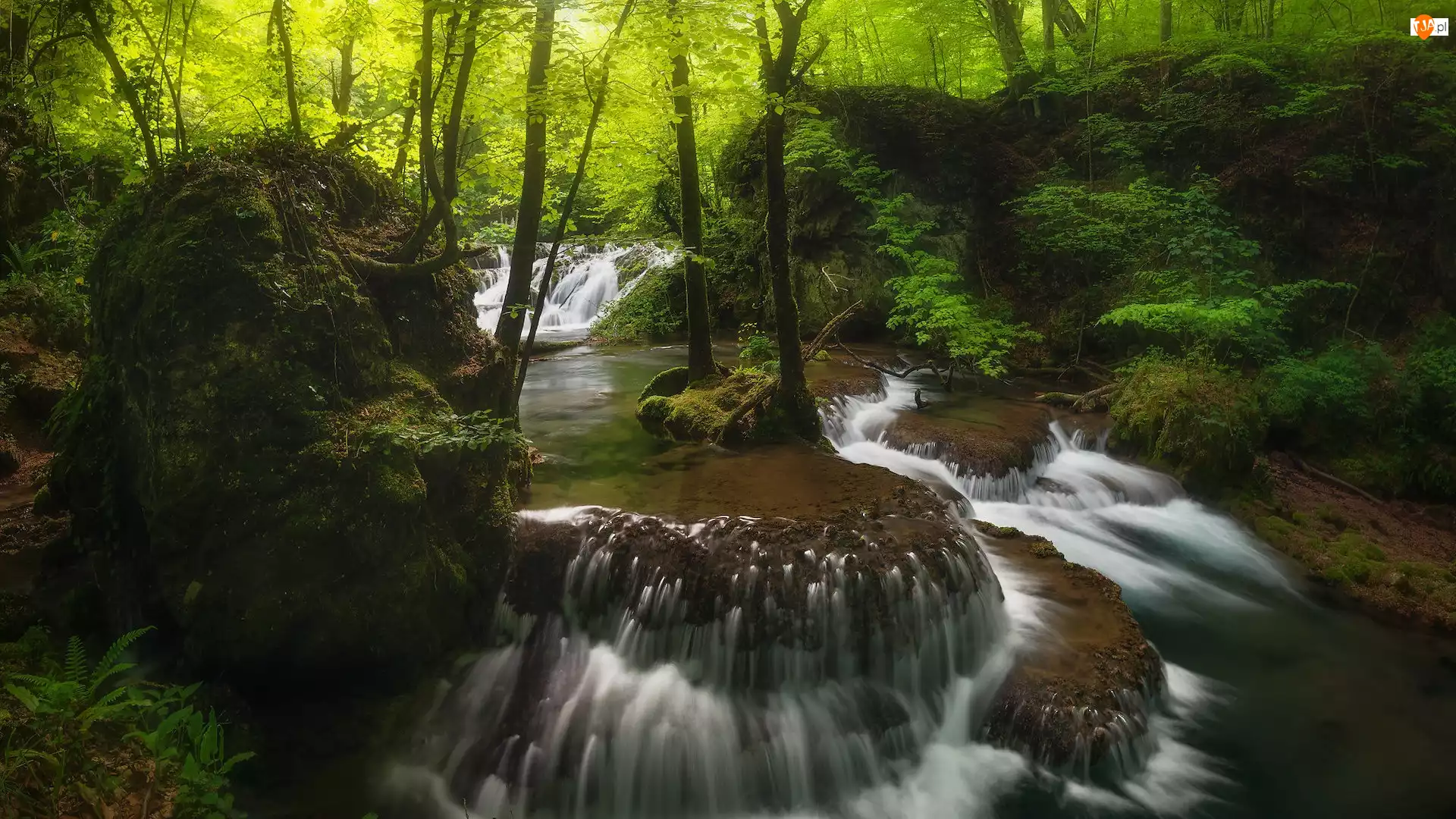 Rzeka, Paprocie, Drzewa, Las, Kaskada