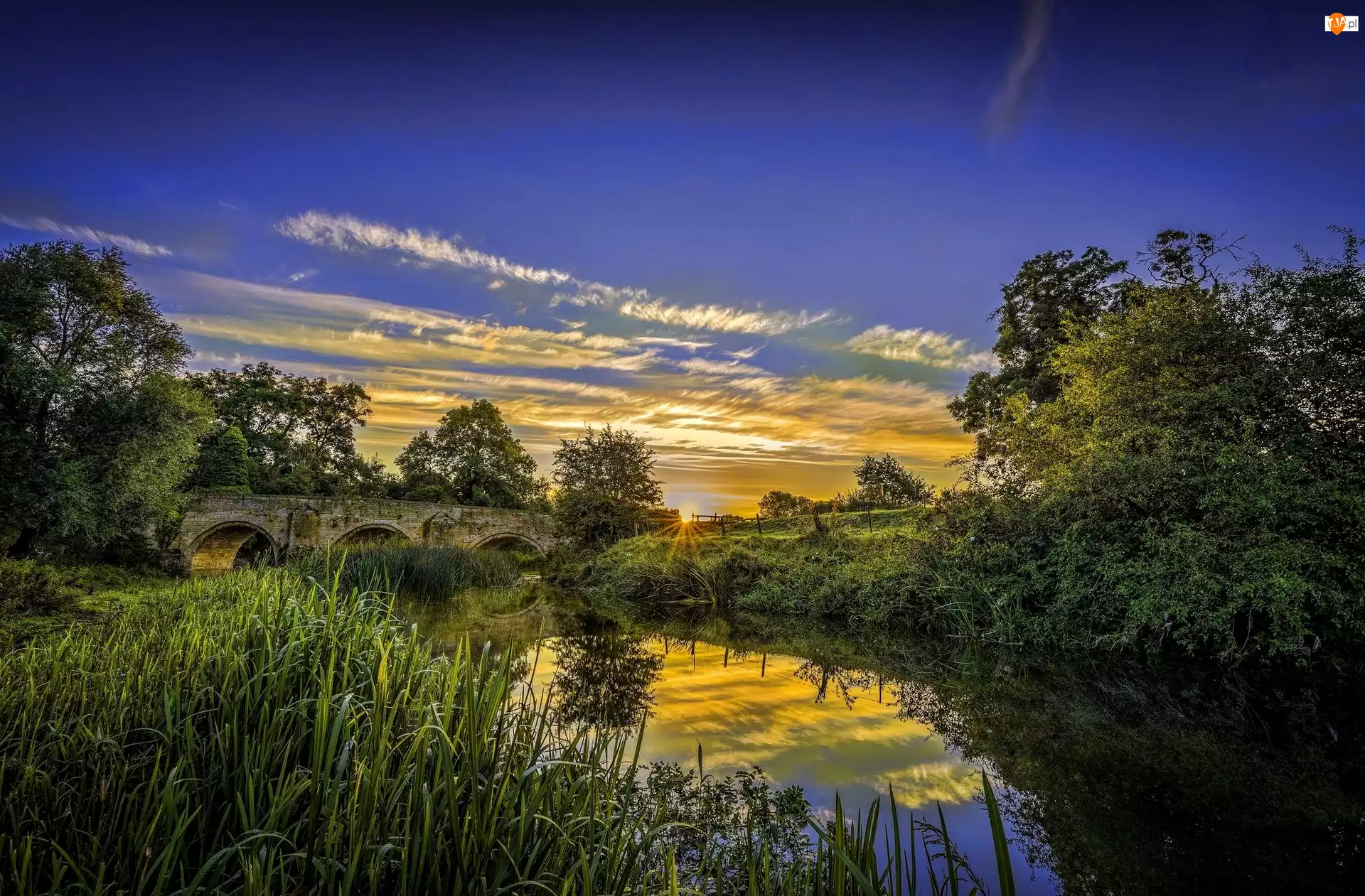 Rzeka pośród traw i kamienny most
