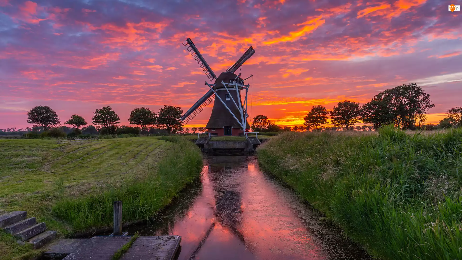 Rzeka, Wiatrak, Niebo, Drzewa, Pole, Zachód słońca