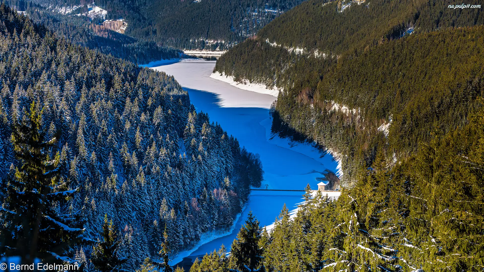 Las Turyński, Jezioro Ohratalsperre, Niemcy, Góry, Turyngia, Zima, Drzewa