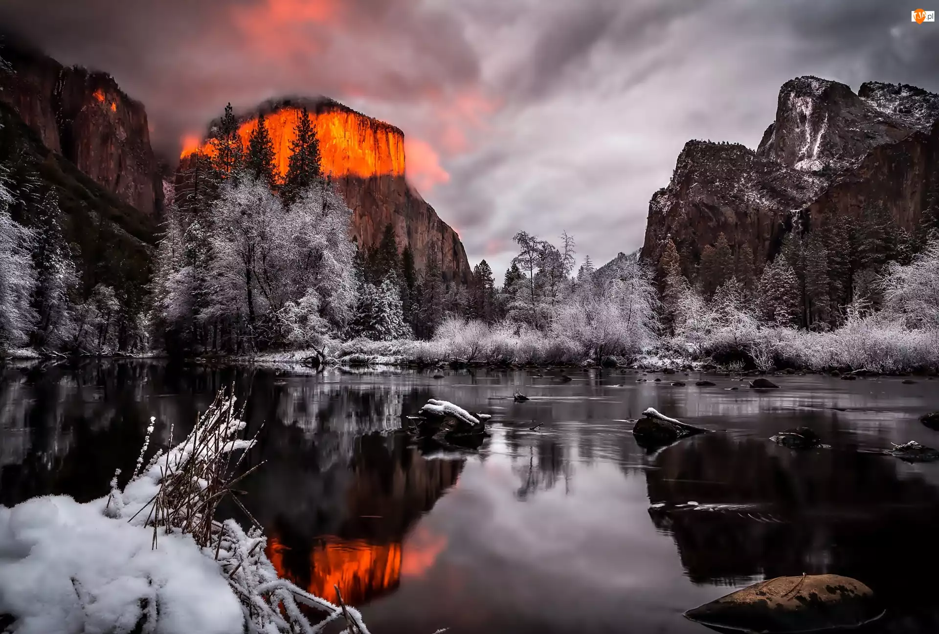 Rzeka, Yosemite, Zima, Kalifornia, Góry, Las