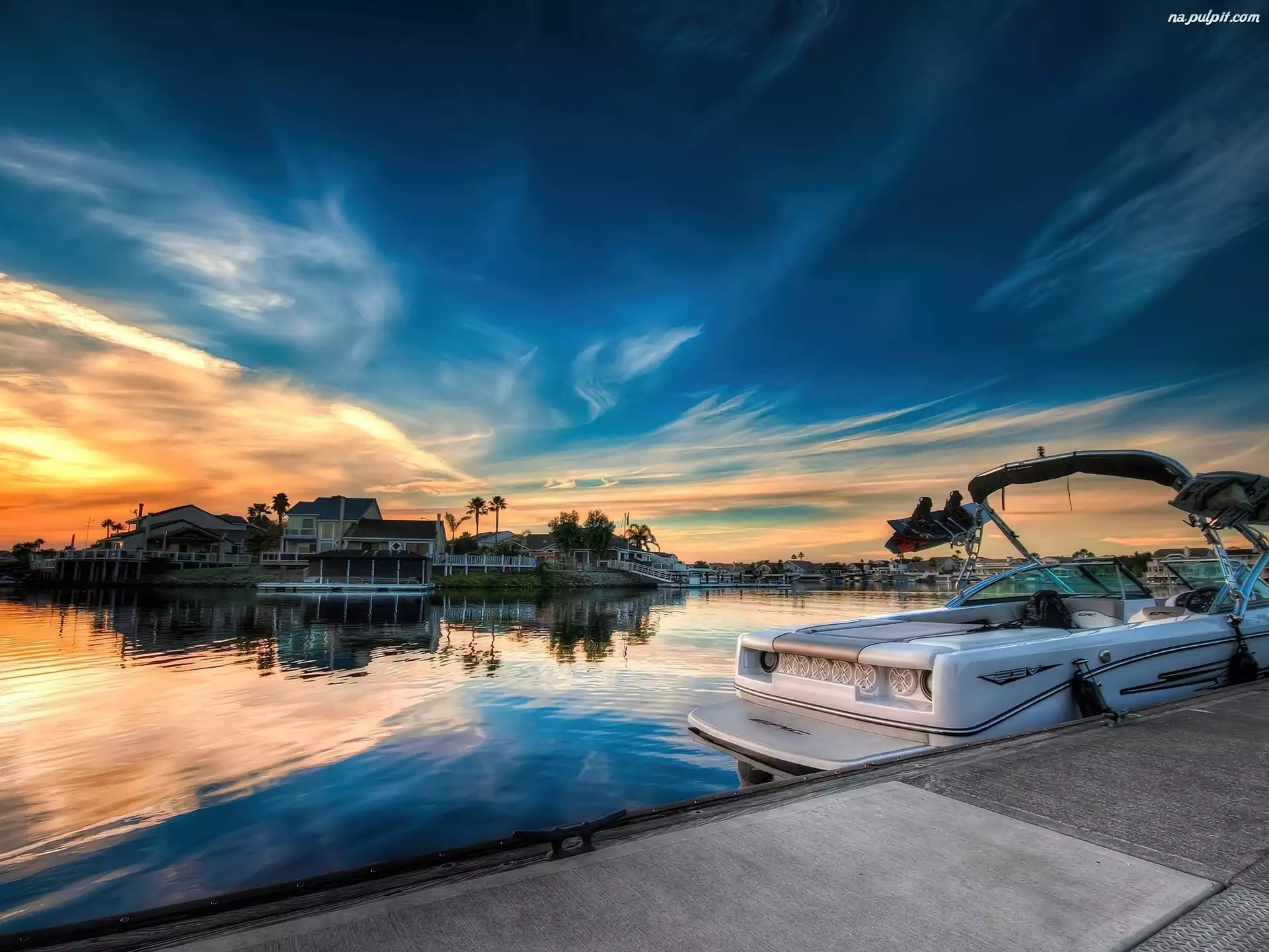 Rzeka, Zachód, Niebo, Słońca, Motorówka