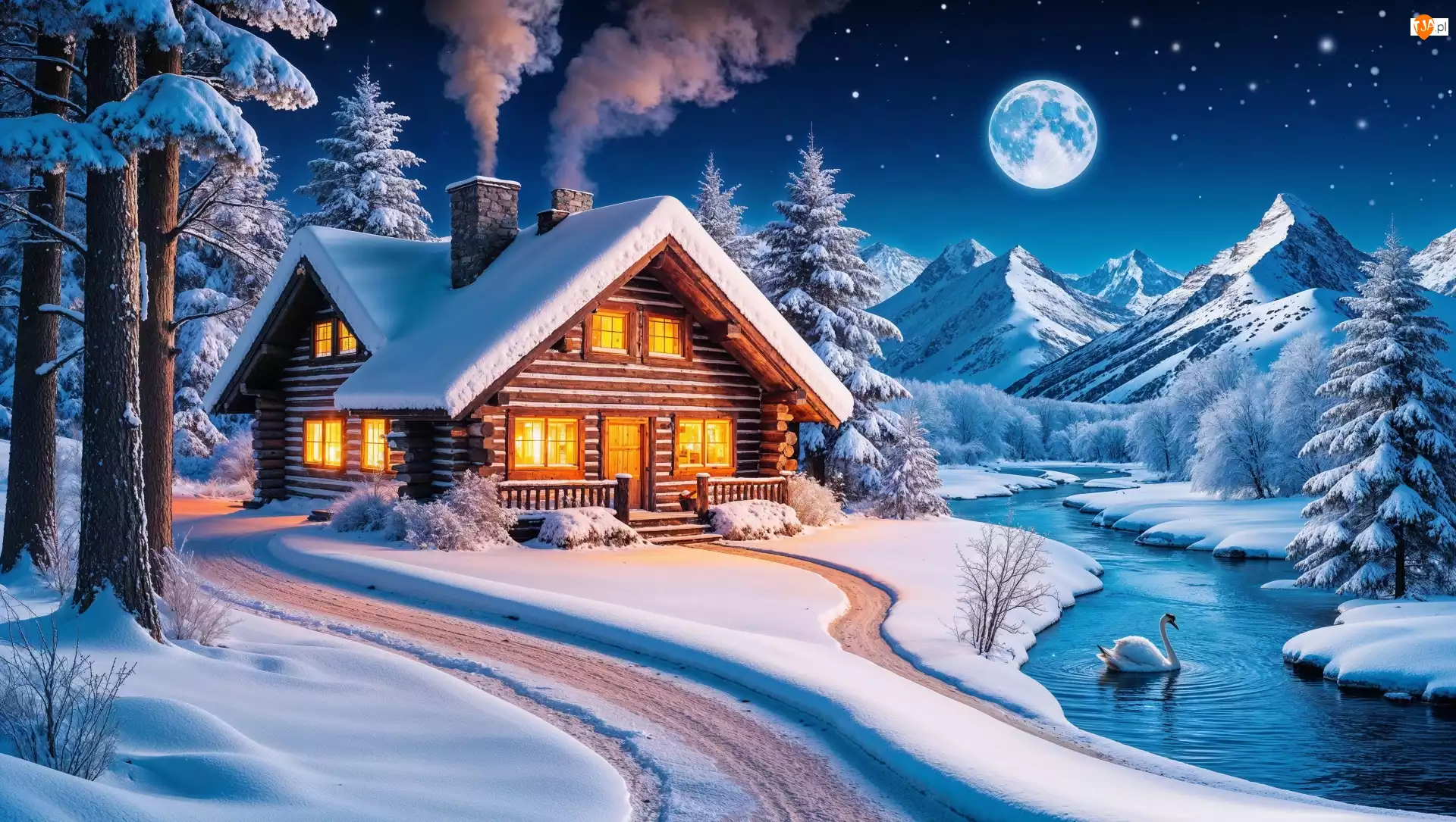 Rzeka, Zima, Dom, Grafika, Łabędź, Góry