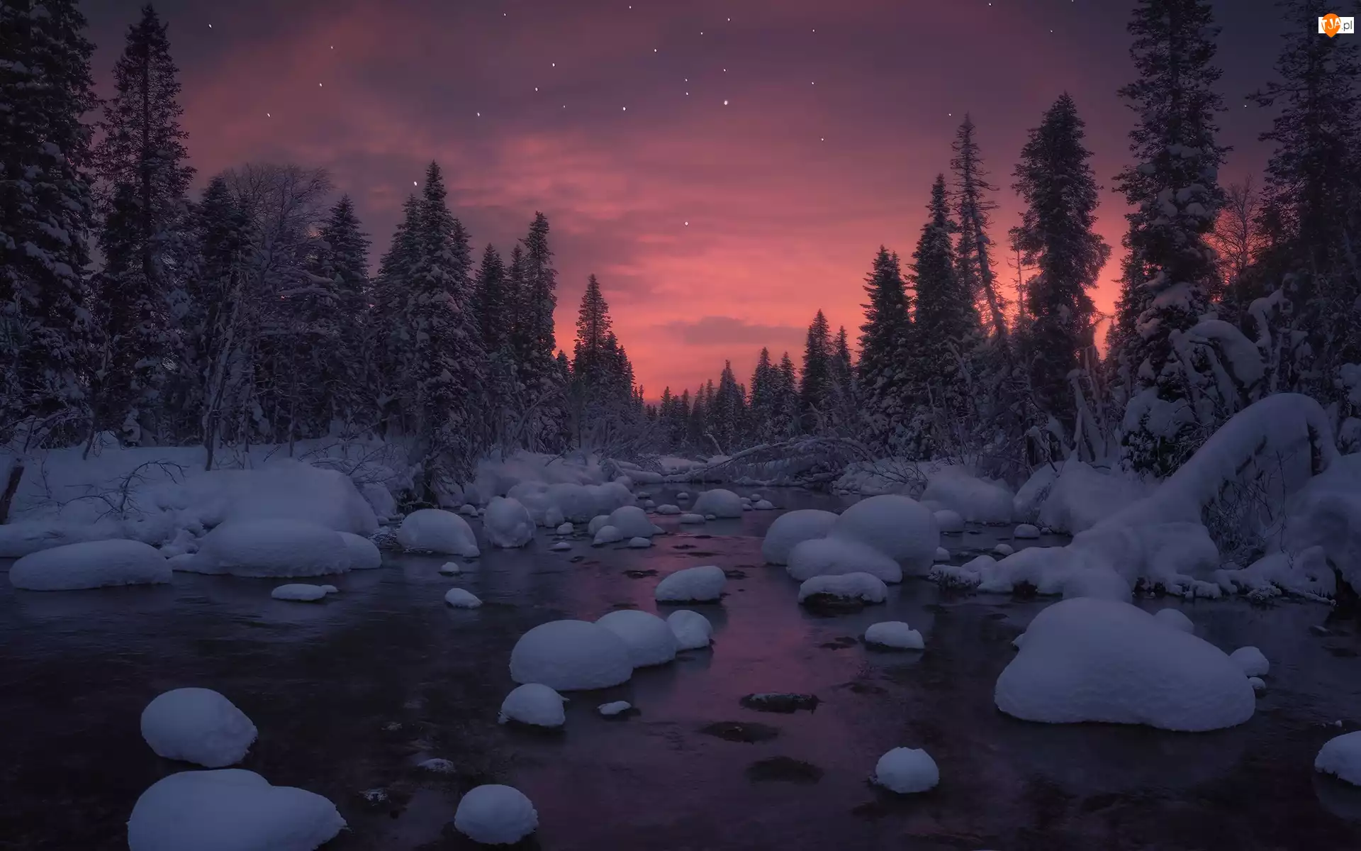 Rzeka, Zima, Drzewa, Gwiazdy, Ośnieżone, Noc