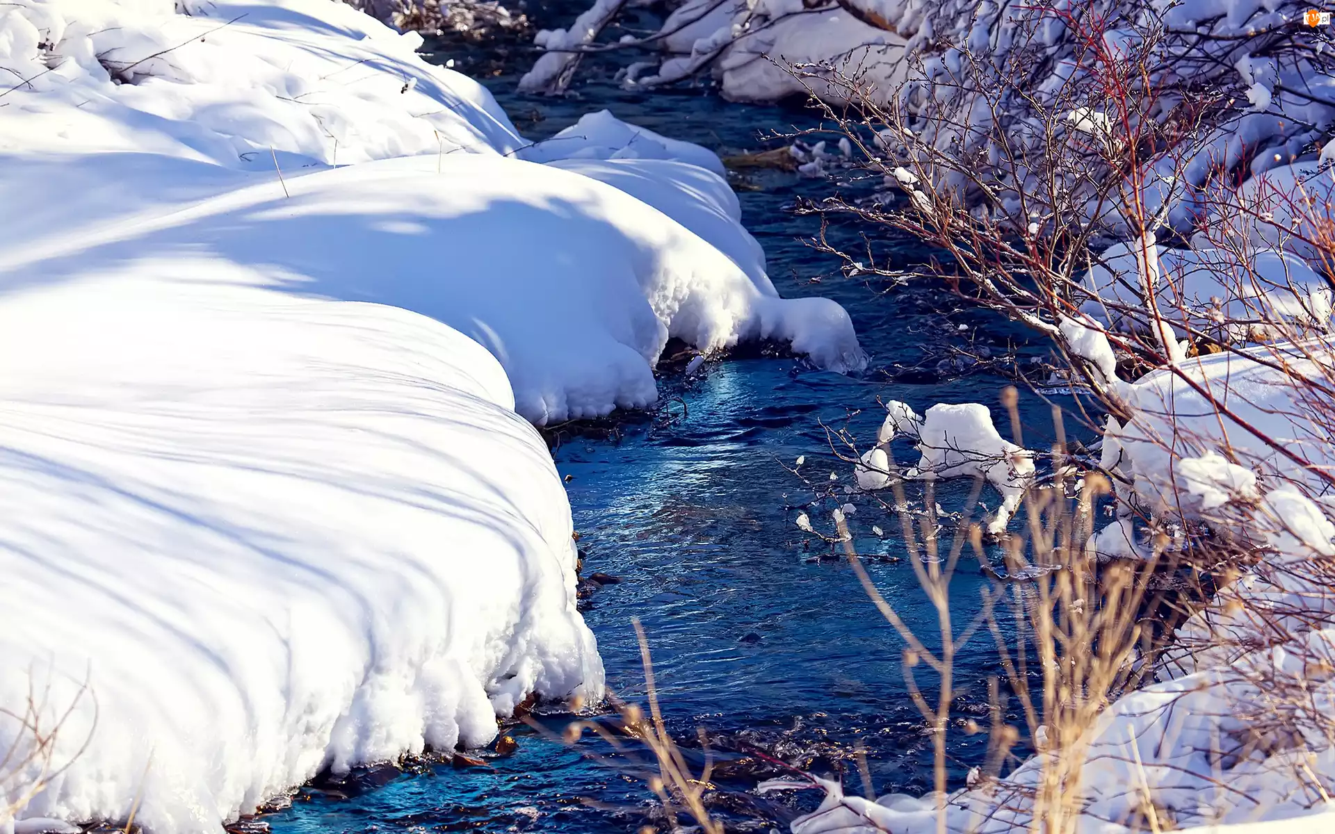Rzeka, Zima, Krzewy, Śnieg